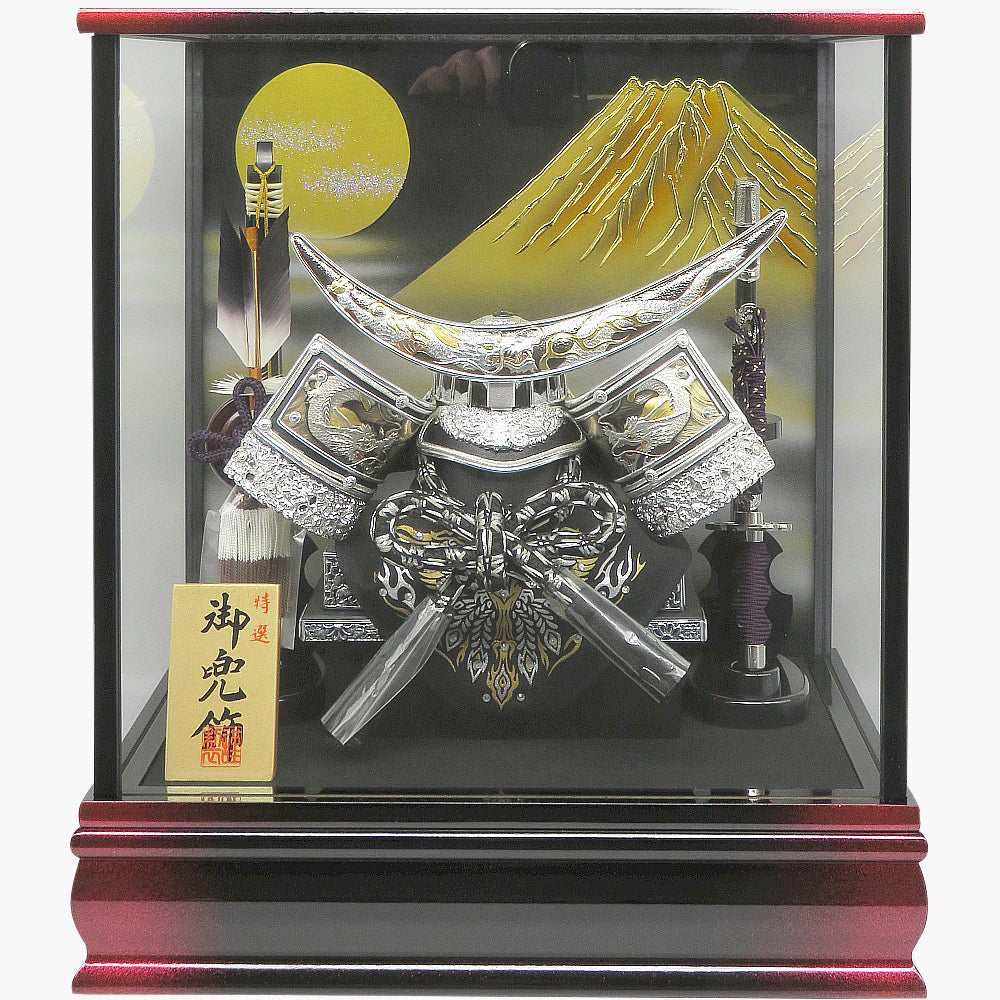 背景に栄え兜が引き立つケース入り飾りです