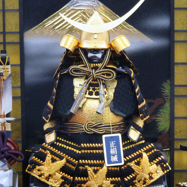 前面はアクリルで仕立て、背景の壮大な金山に栄える鎧飾りです
