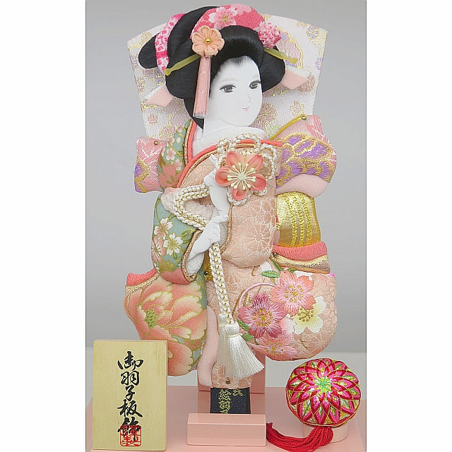 お花を散りばめた縁起の良い吉祥柄衣装で末広がりに幸あることを願う羽子板飾りです