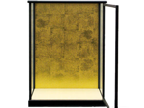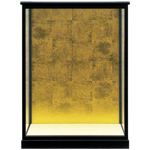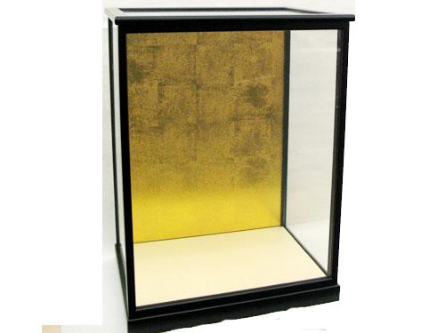 しっかりとしたつくりの木製、前扉、金バックのガラスケースです