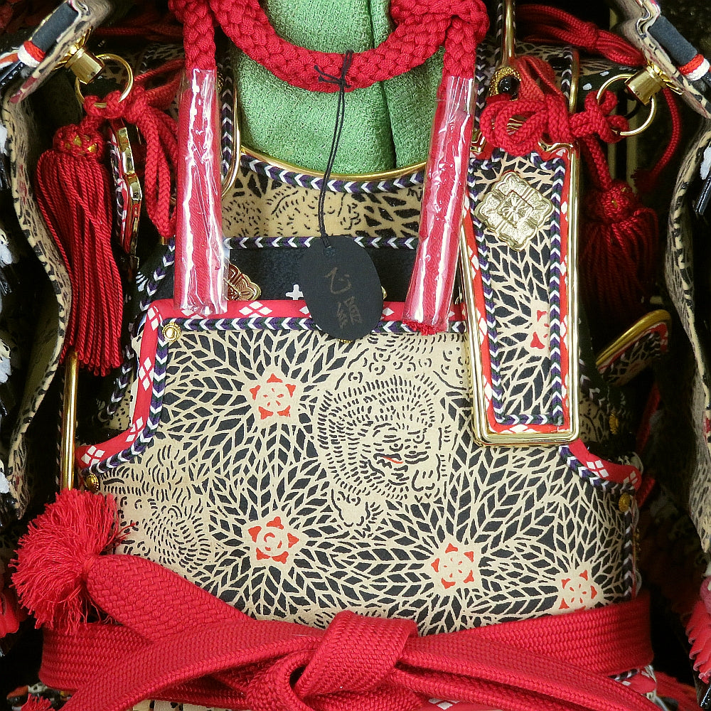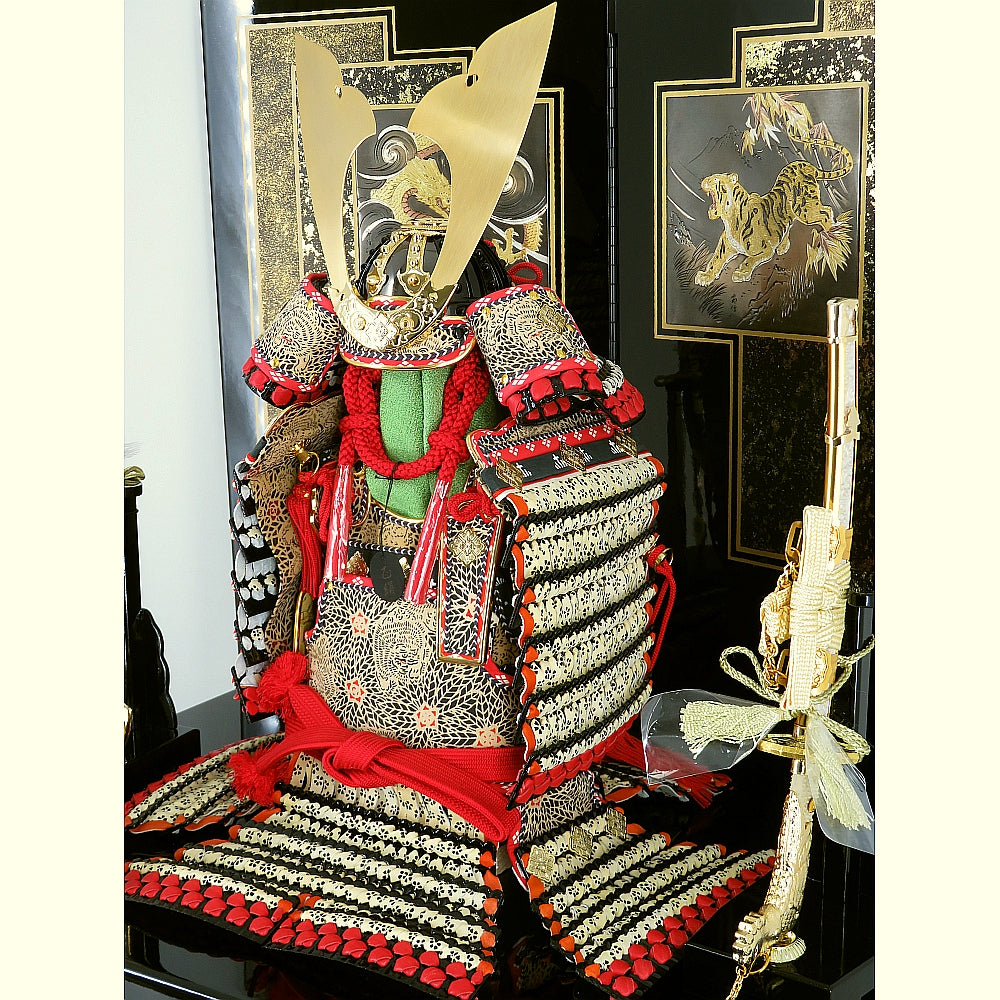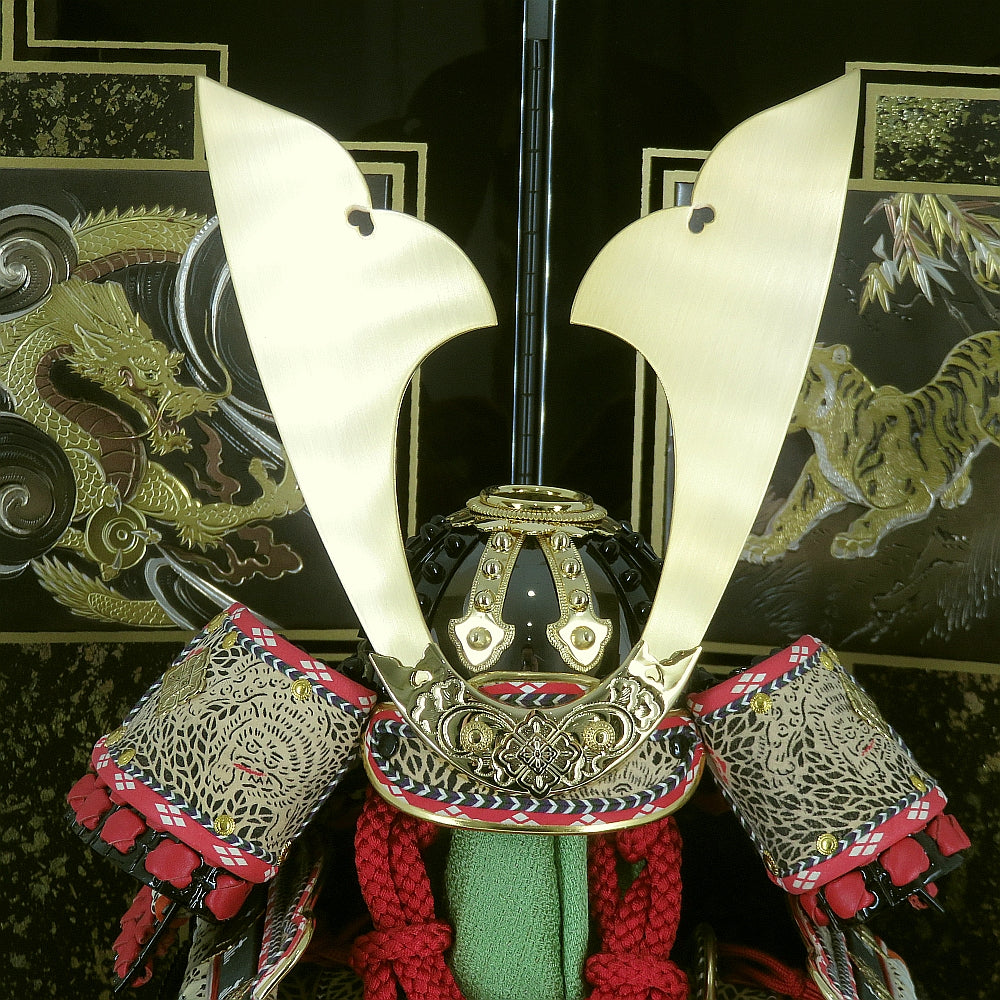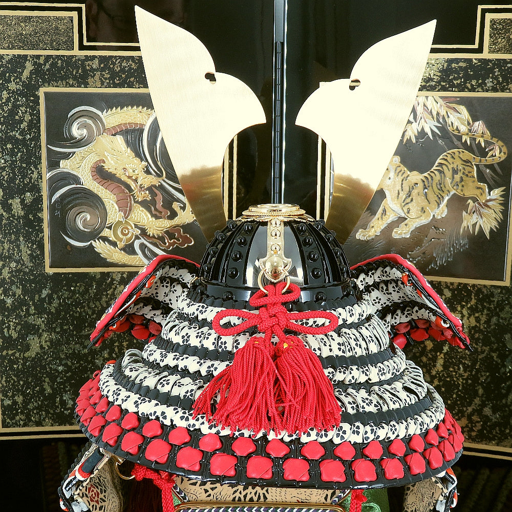 背景の龍虎屏風が勇ましく飾り台の中に収納できます