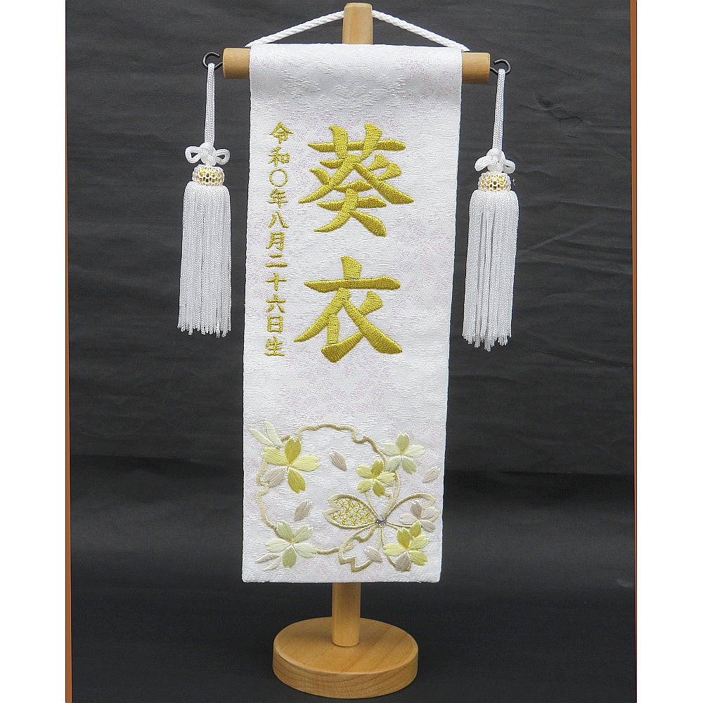 豪華金糸太楷書体の刺繍仕立ての名前旗飾りで御名前と生年月日をお入れ致します。