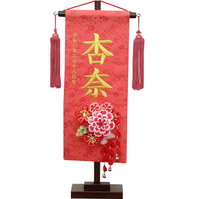 豪華金糸太楷書体の刺繍仕立ての名前旗飾りで御名前と生年月日をお入れ致します。