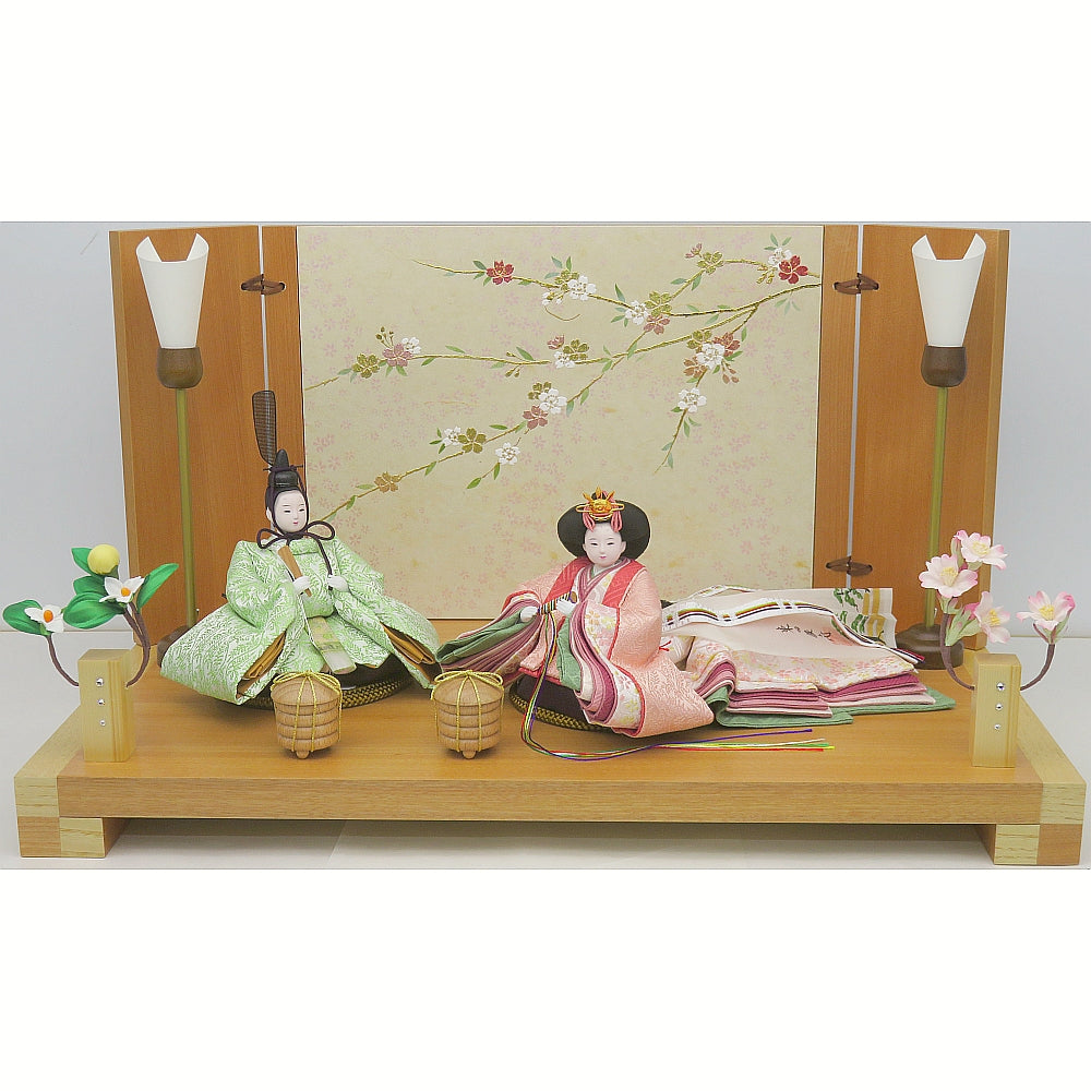 木製飾台の足元は市松模様に木を重ね福を招くデザインで暖かみのある春らしい上品な飾りです