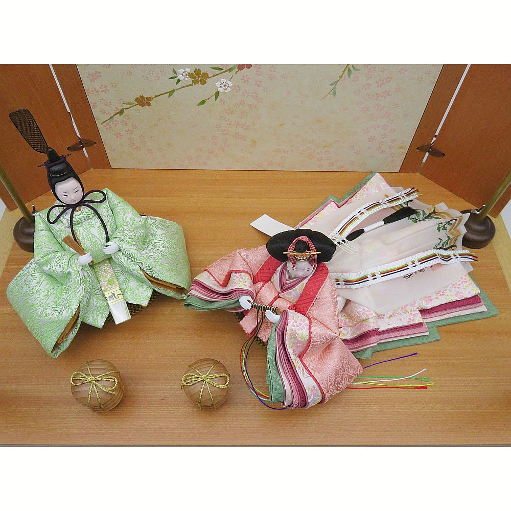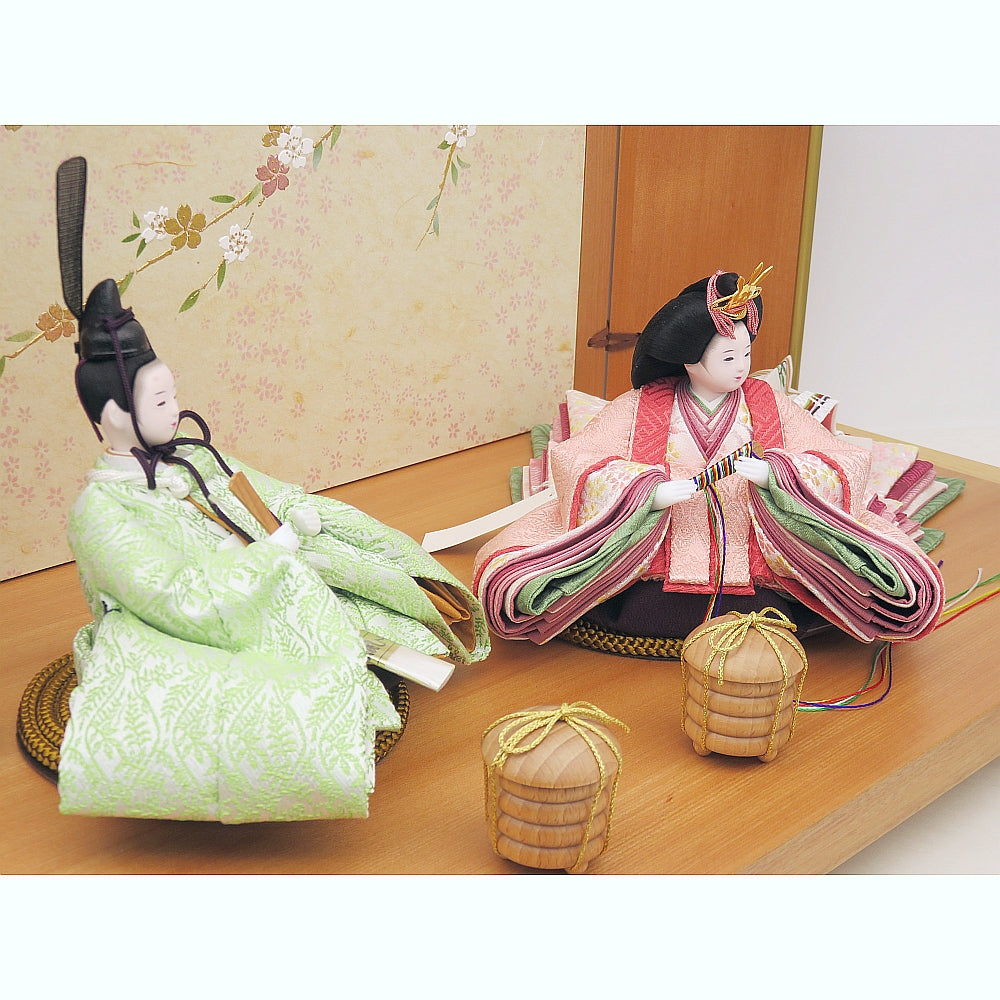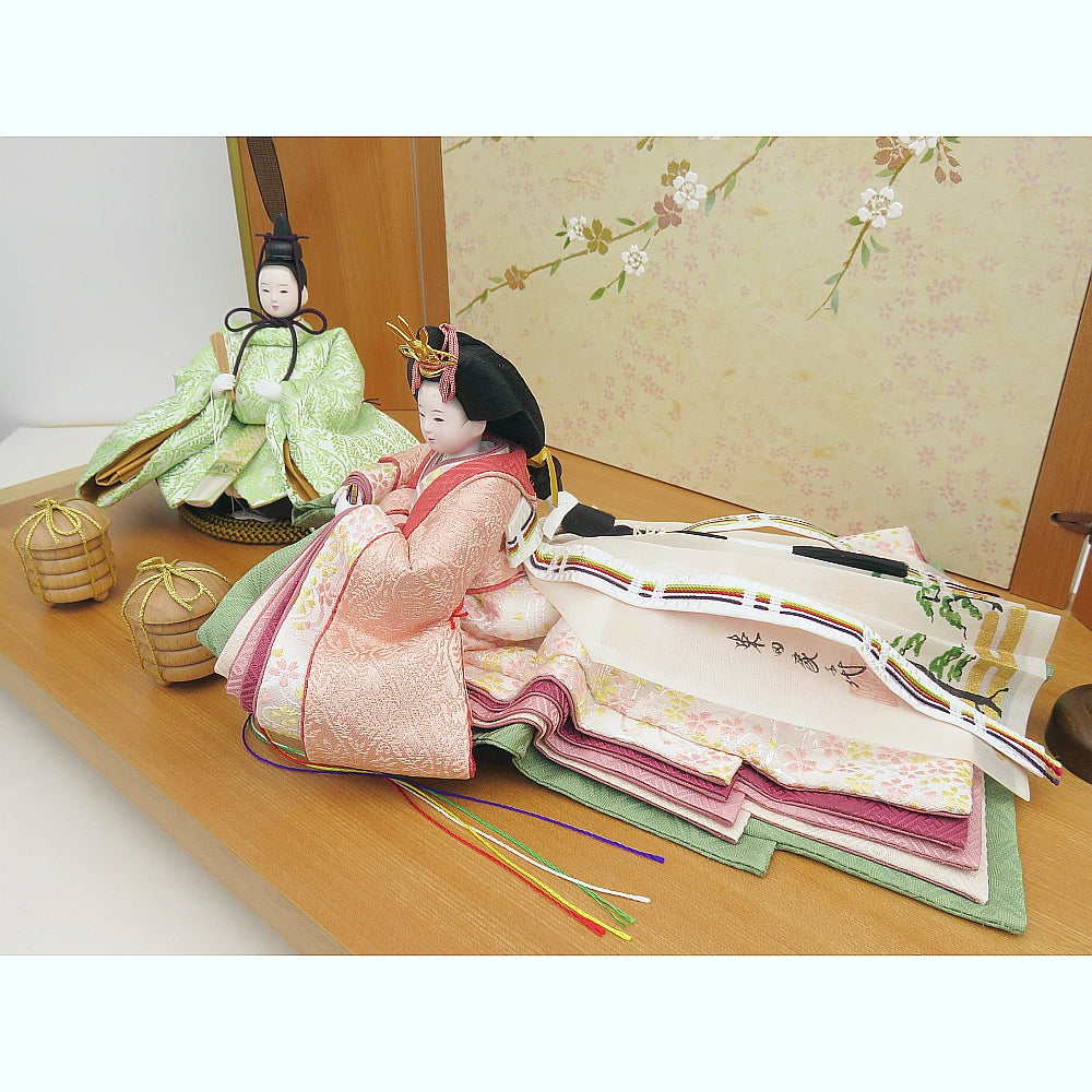 優雅な平安衣裳の裾をひき向かい合わせに語らう雰囲気のあるお雛さまです