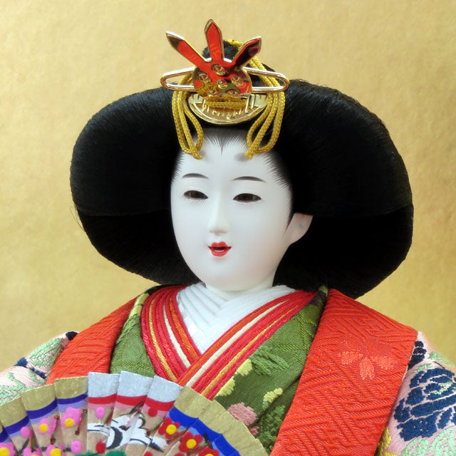華やかなひな祭りを演出する伝統的スタイル赤い毛氈に金屏風の十五人七段揃飾りです。優雅な雰囲気の雛人形飾り、皆様お揃いで飾るのが楽しみな段飾りです