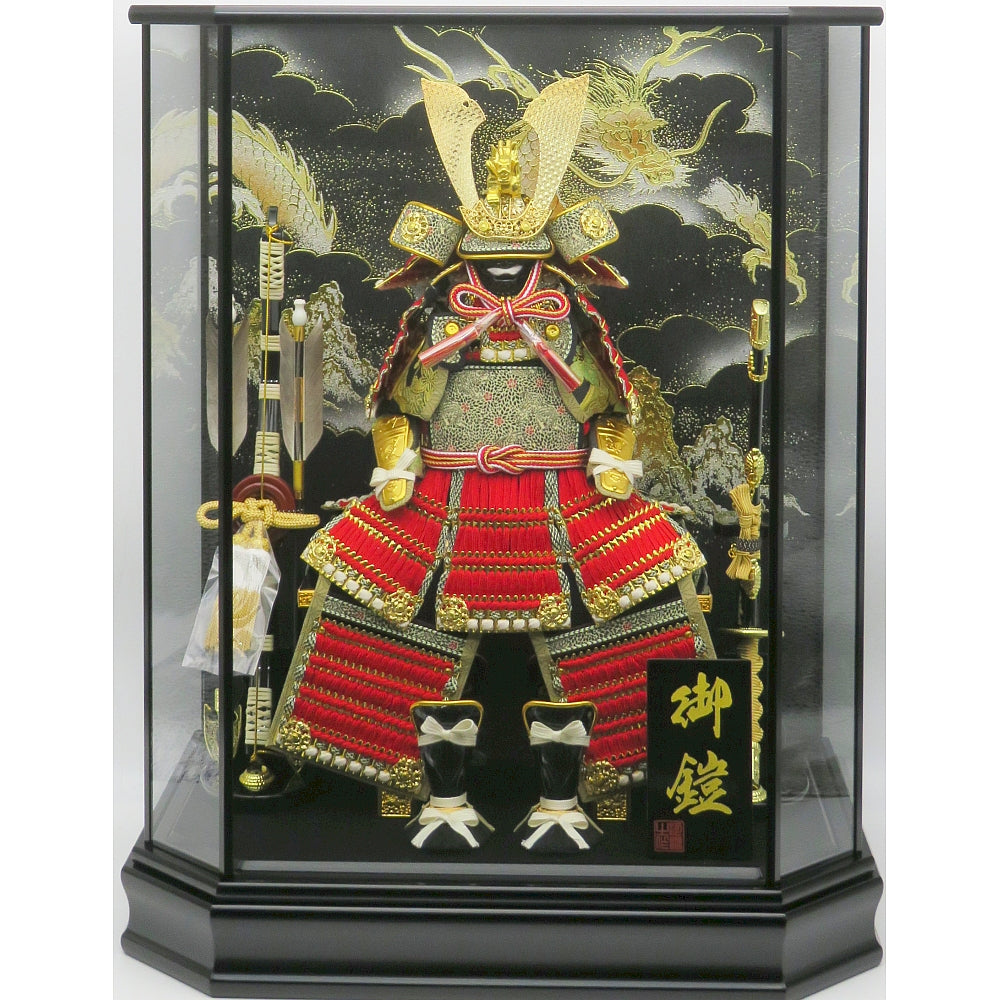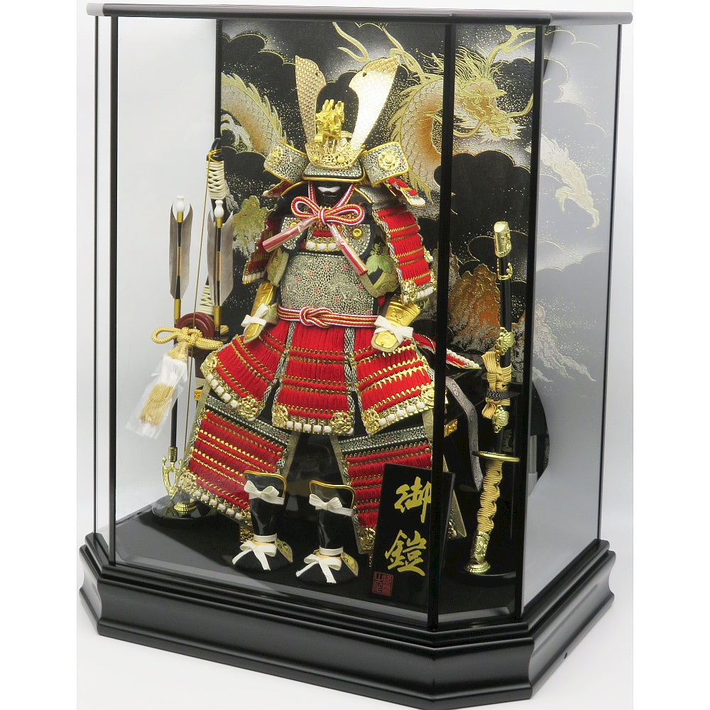 お子様の健やかな成長を願って末永くお飾りいただける赤糸縅の中鍬鎧ガラスケース入りです