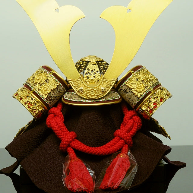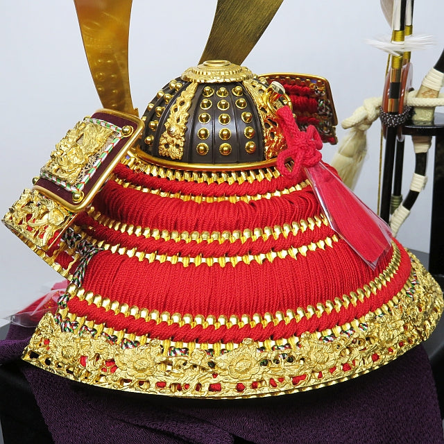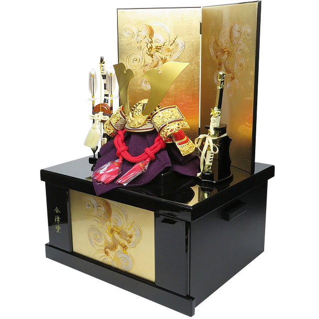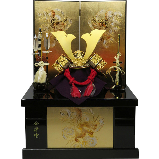 【商品名】純金箔押大鍬兜 10号 正絹赤糸縅 会津塗双龍収納飾