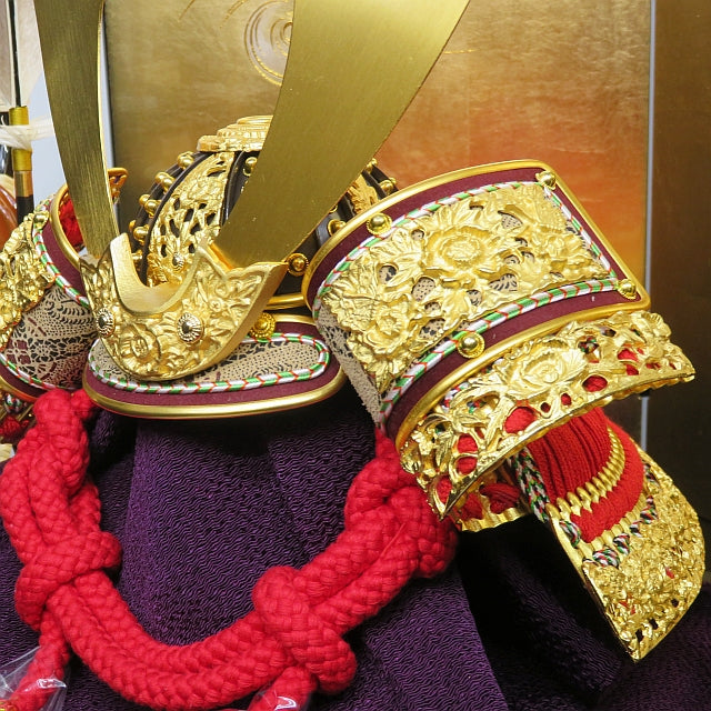 純金箔押大鍬兜 10号 正絹赤糸縅 会津塗双龍収納飾