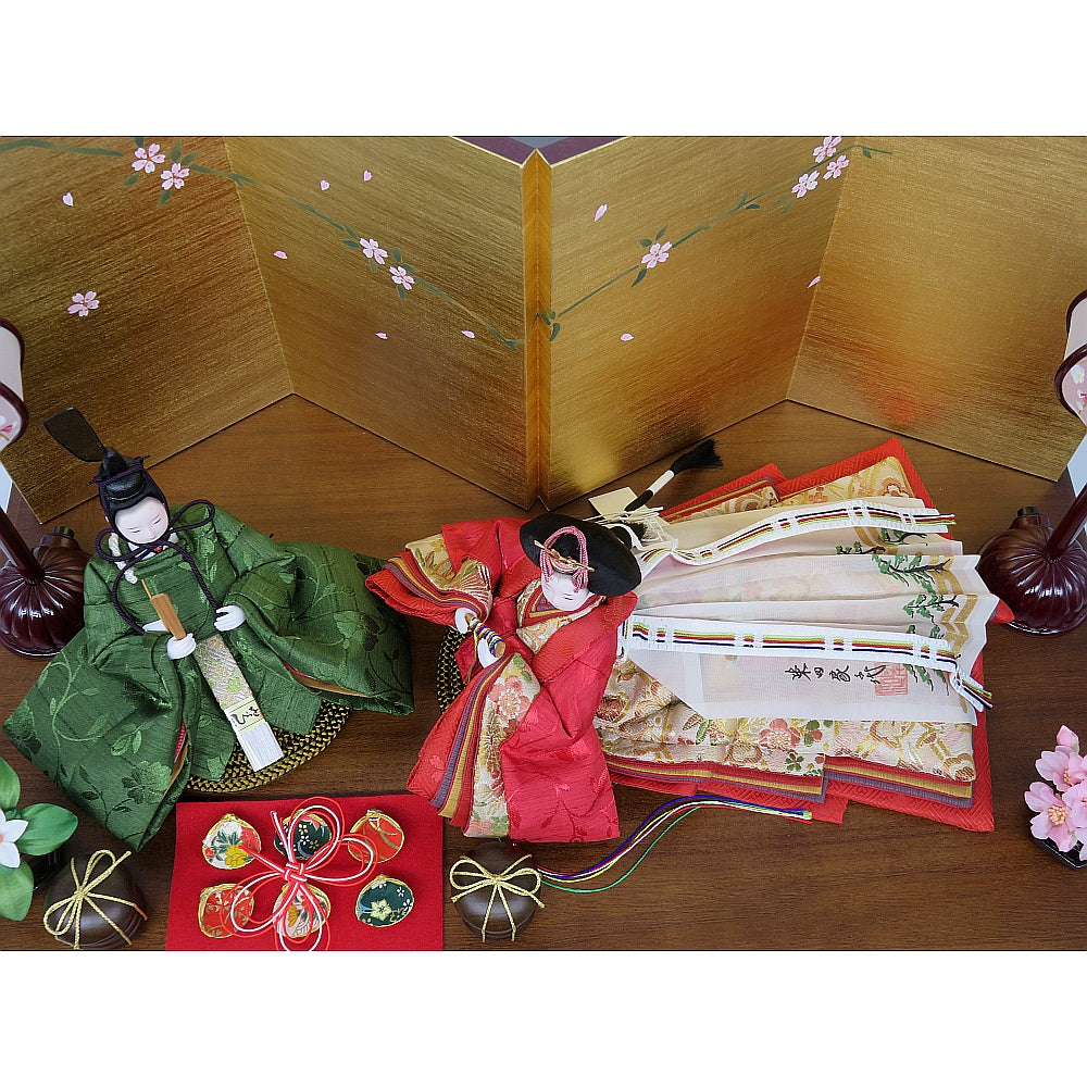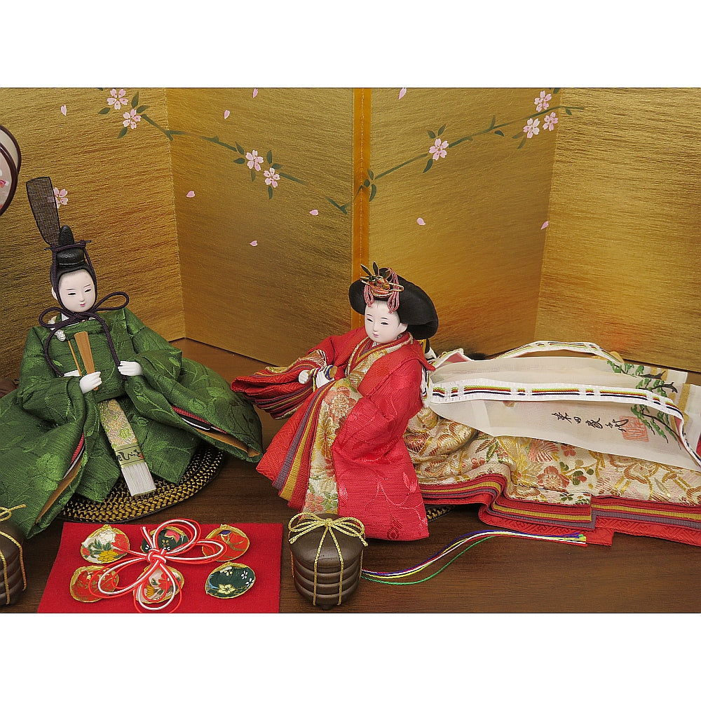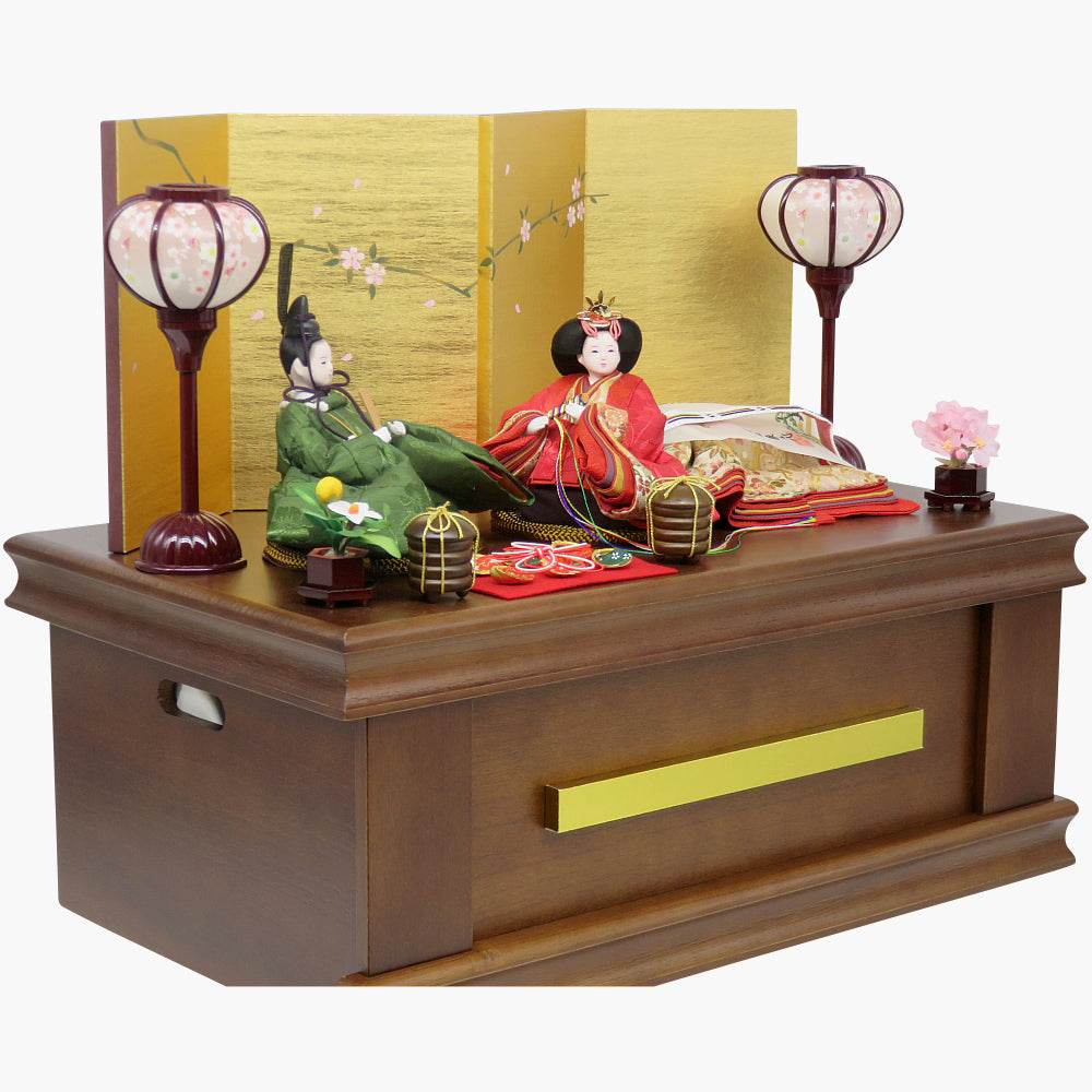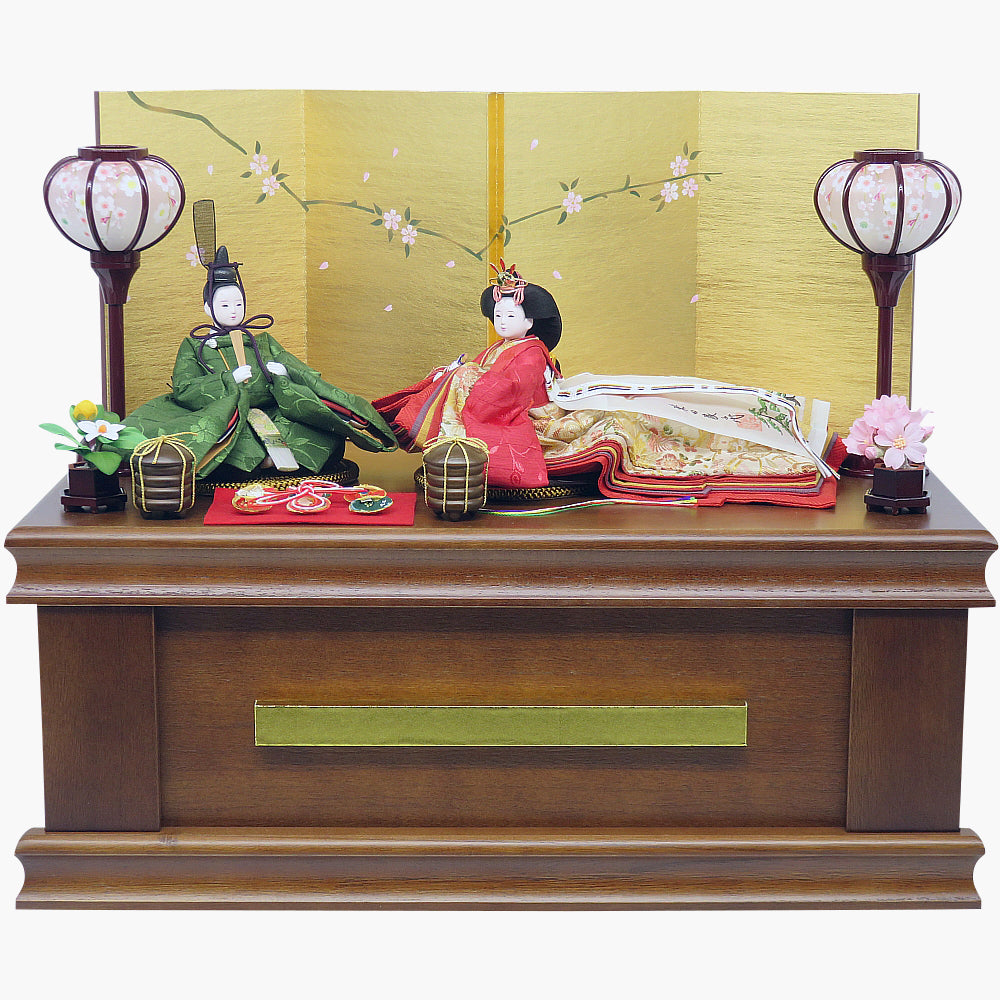枝小桜の金屏風と華やかな暖かみのある桐収納飾りでコンパクトにおしまいになれます