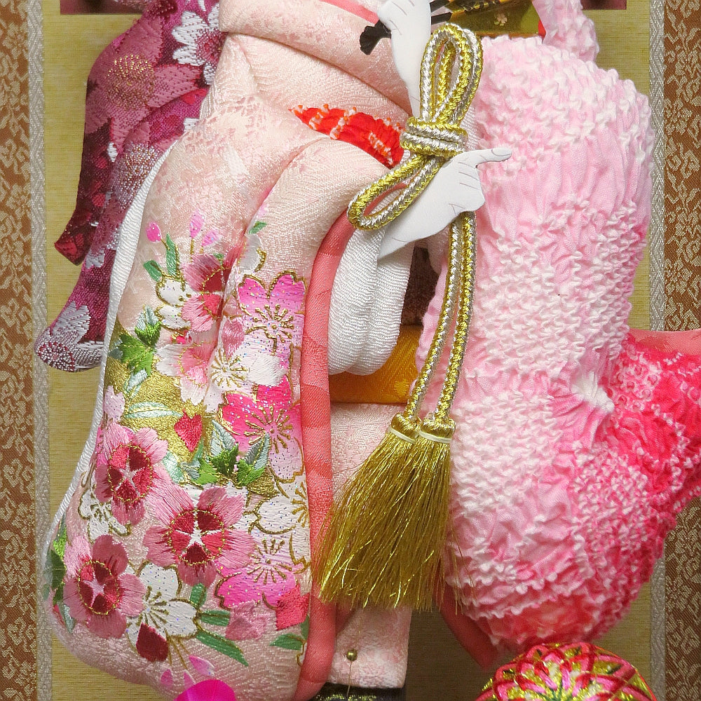 可愛らしい桜刺繍と優しい鹿の子で仕立てた振袖羽子板飾りです