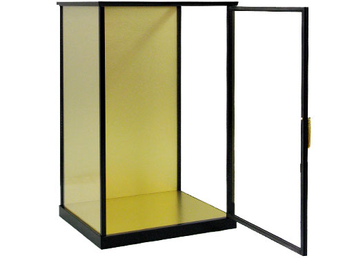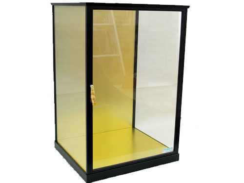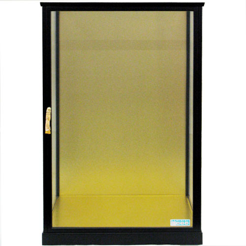 しっかりとしたつくりの木製、前扉、金バックのガラスケースです
