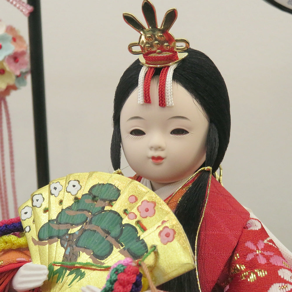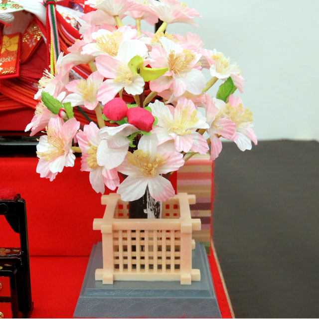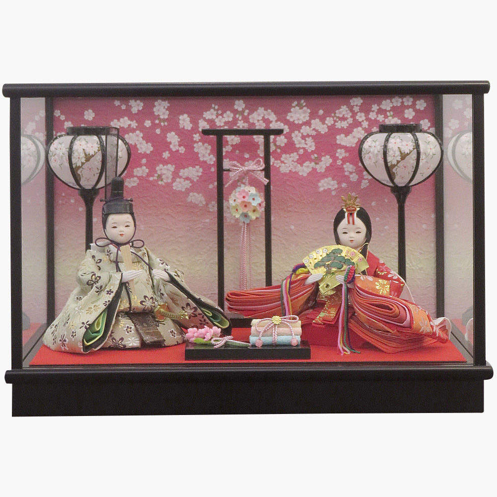 桜が満開の背景に向かい合って語らう雰囲気のあるお雛様飾りです