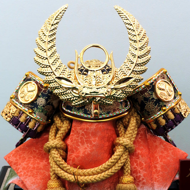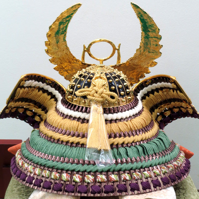 上品な作風の兜飾りです。兜の縅(おどし)や吹き返し、金具の使い方が大変美しく映えます。