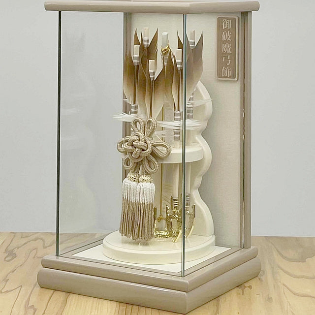 暖かみのあるベージュに厚板の合わせガラスケースで前柱がなく破魔弓飾りが引き立ちます