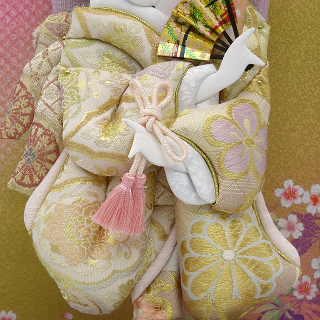 背景に桜刺繡を施したガラスケースで合わせ春らしい雰囲気のお正月飾りです
