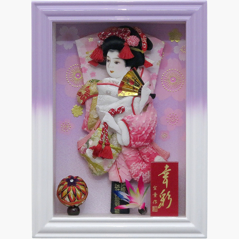 優しい彩の有松しぼりと刺繍の振袖が綺麗な羽子板飾りです