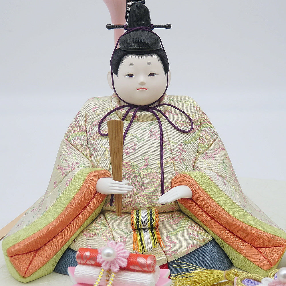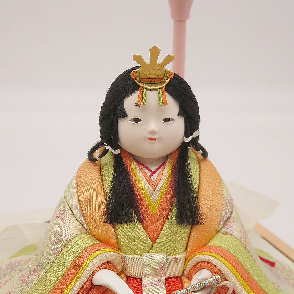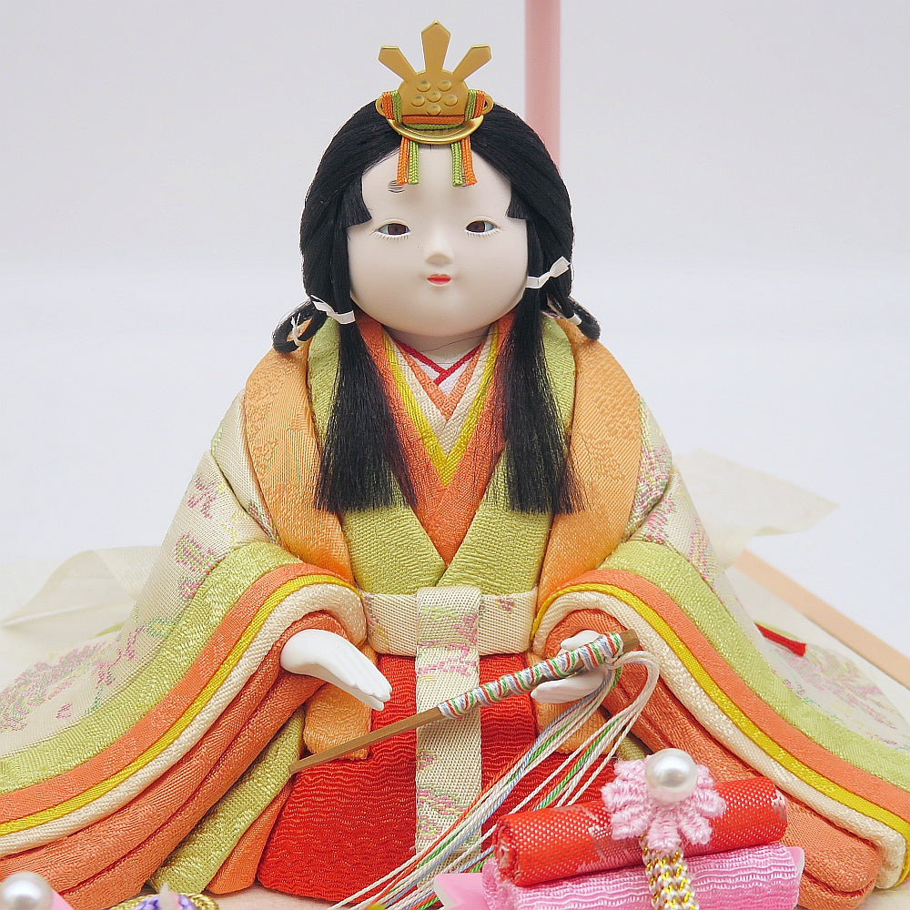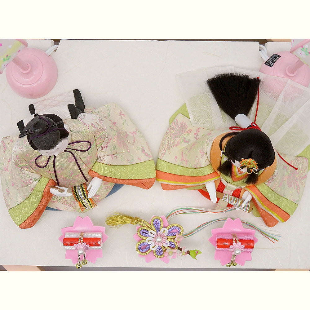 明る優しい彩の白鳳凰柄衣裳の可愛い小雪雛人形ガラスケース入りです