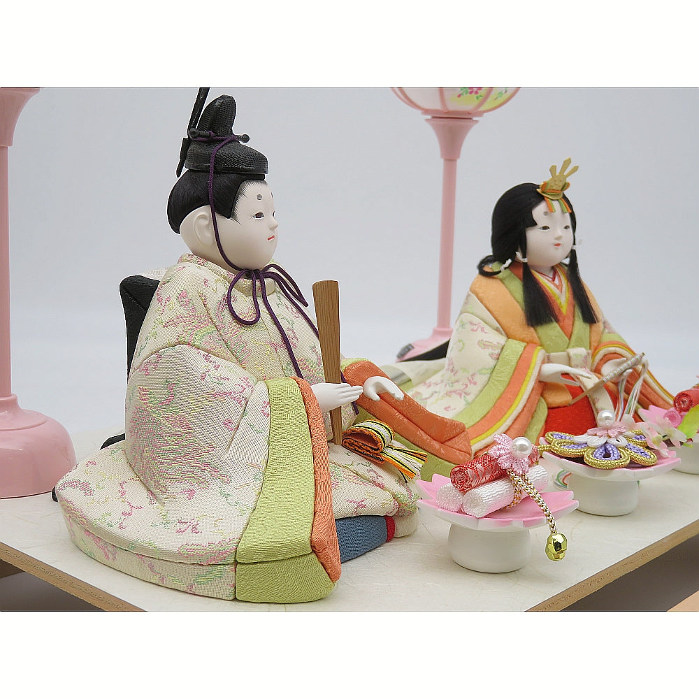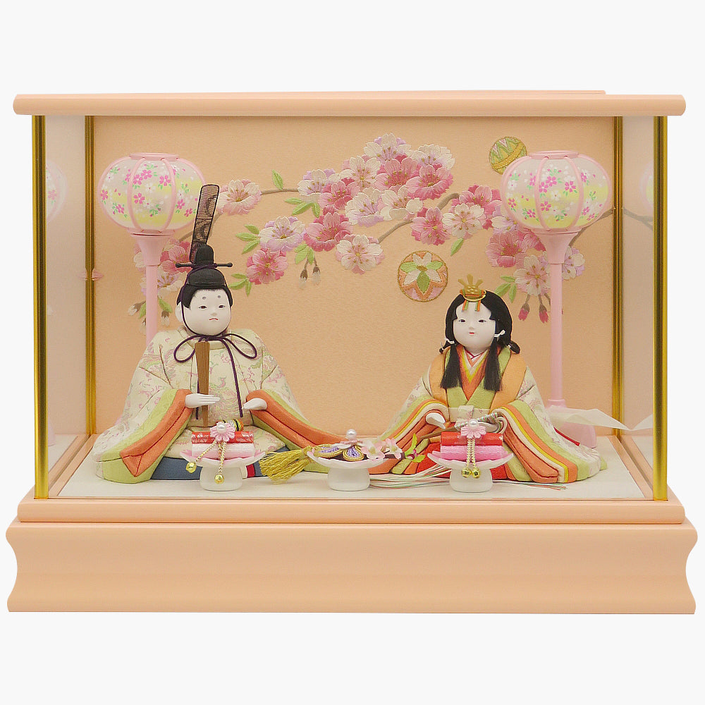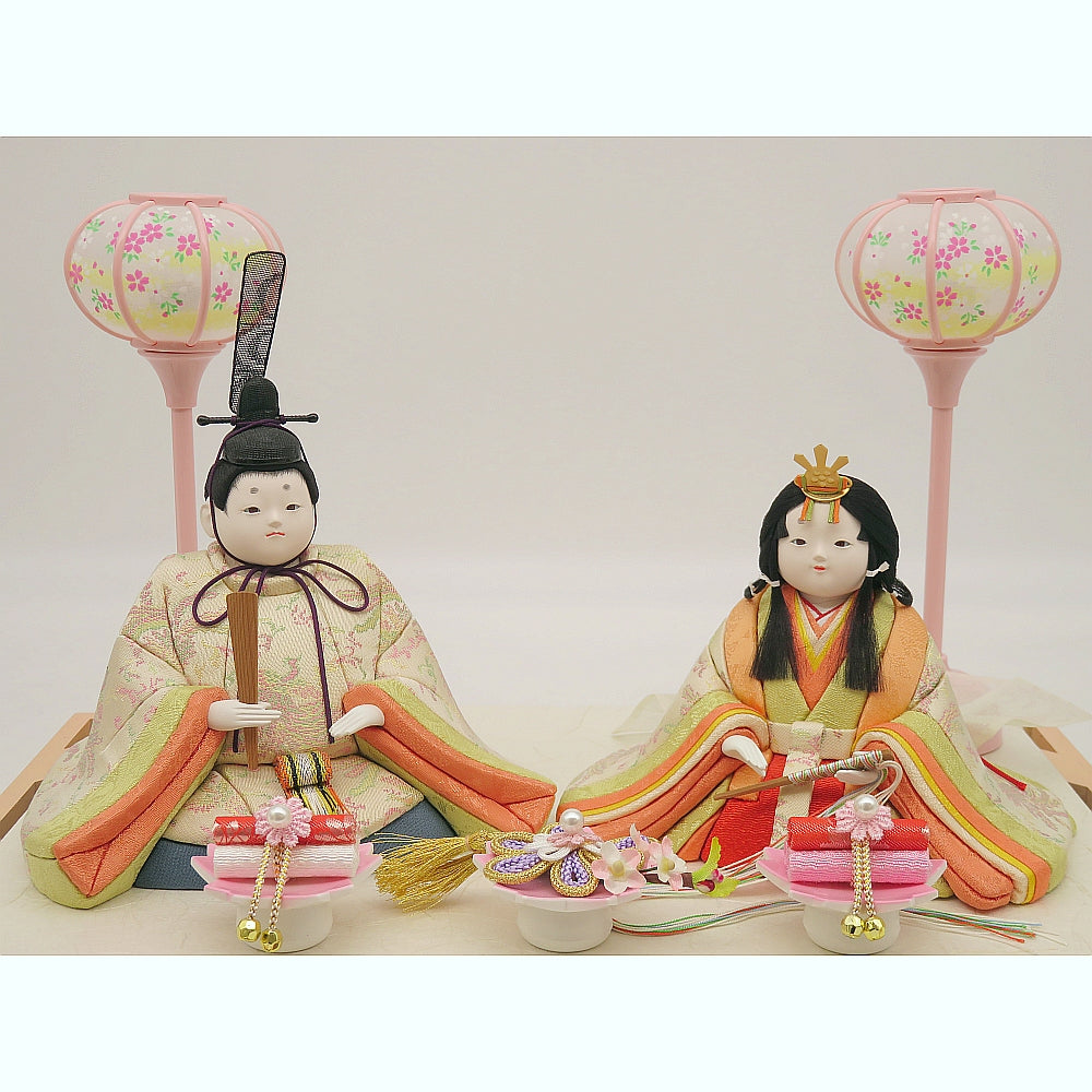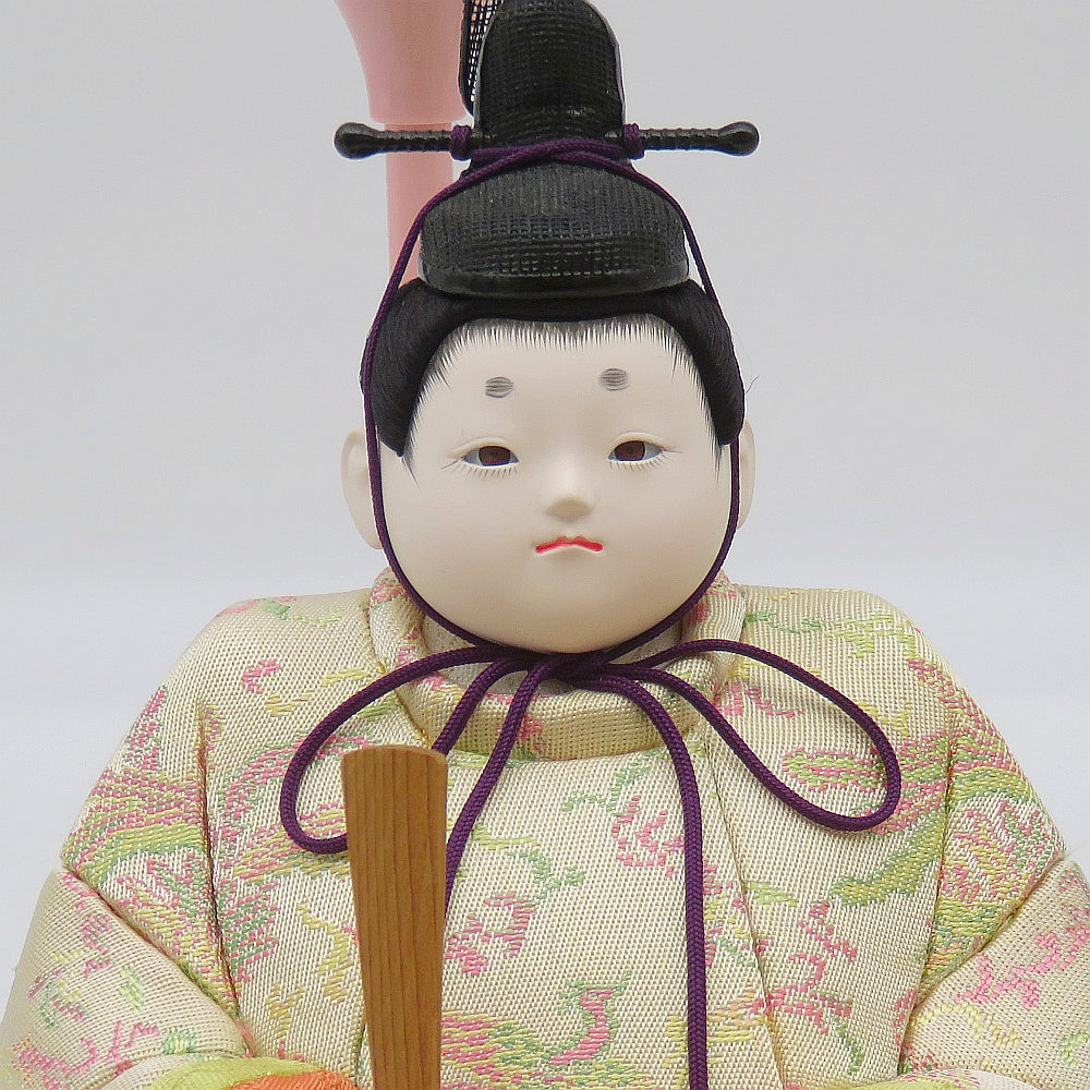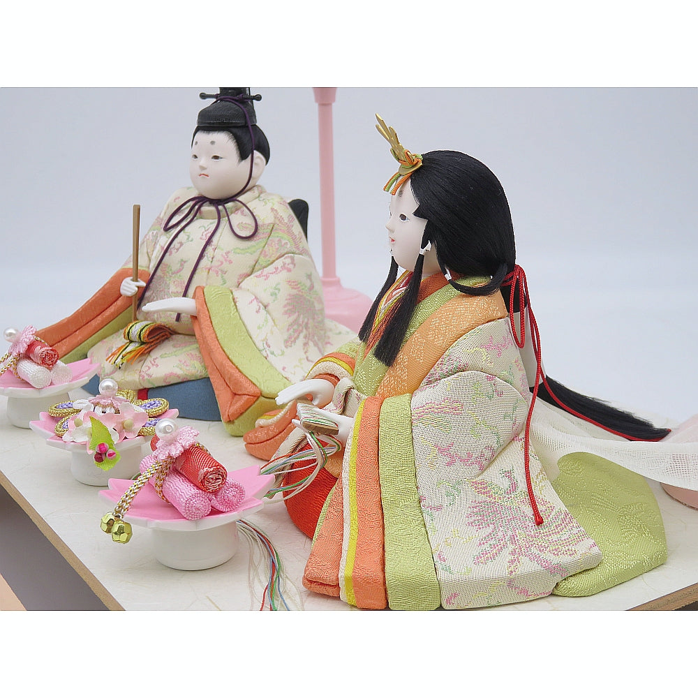 明る優しい彩の白鳳凰柄衣裳の可愛い小雪雛人形ガラスケース入りです