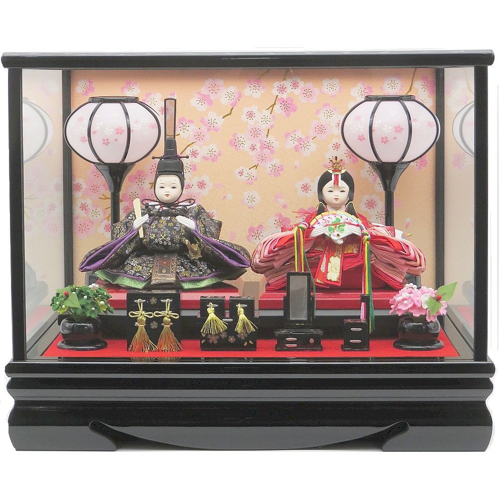 ケース背景の爛漫な桜がひな祭りを演出雰囲気のあるお雛様飾りです