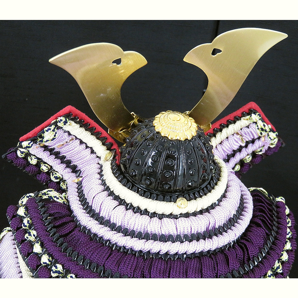 極細小札に紫糸を裾に行くほど濃く綺麗なグラデーションで仕上げた段縅の丁寧なつくり配色が綺麗な鎧飾りです