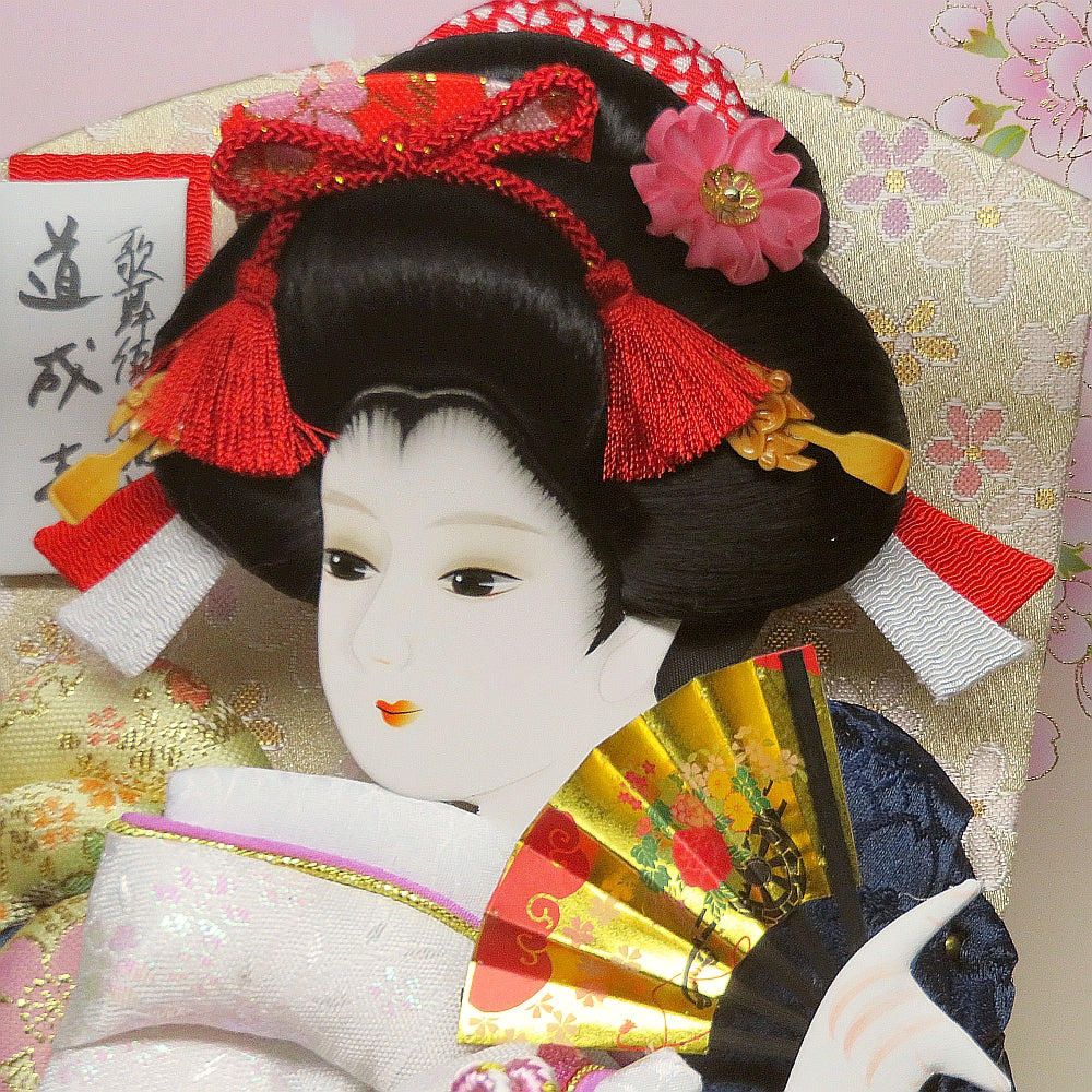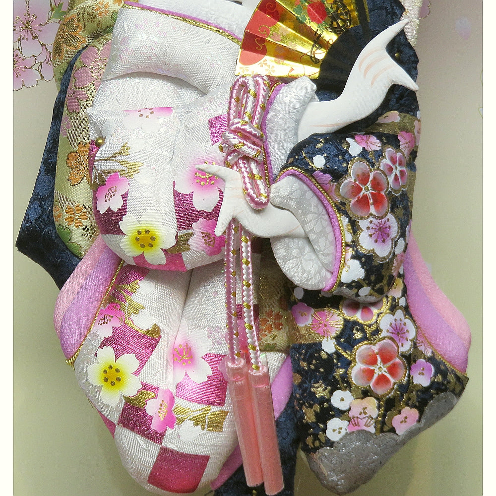 優しい彩の背景に引き立ち栄える羽子板飾りです