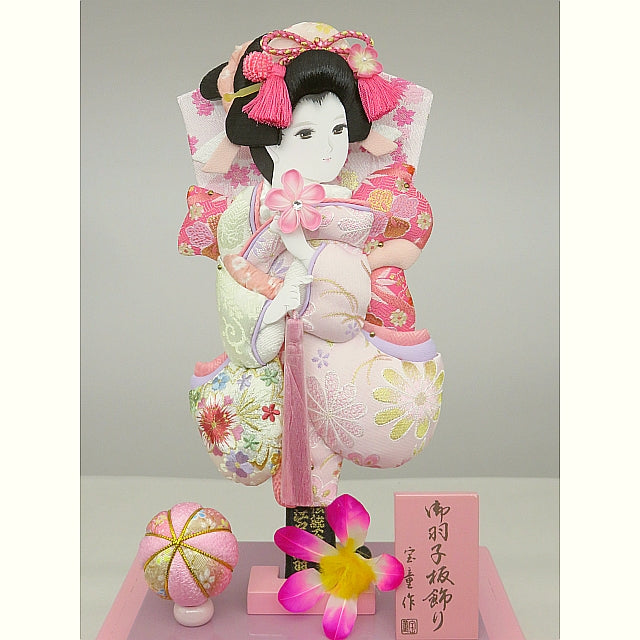 お花を散りばめた縁起の良い吉祥柄衣装で末広がりに幸あることを願う羽子板飾りです