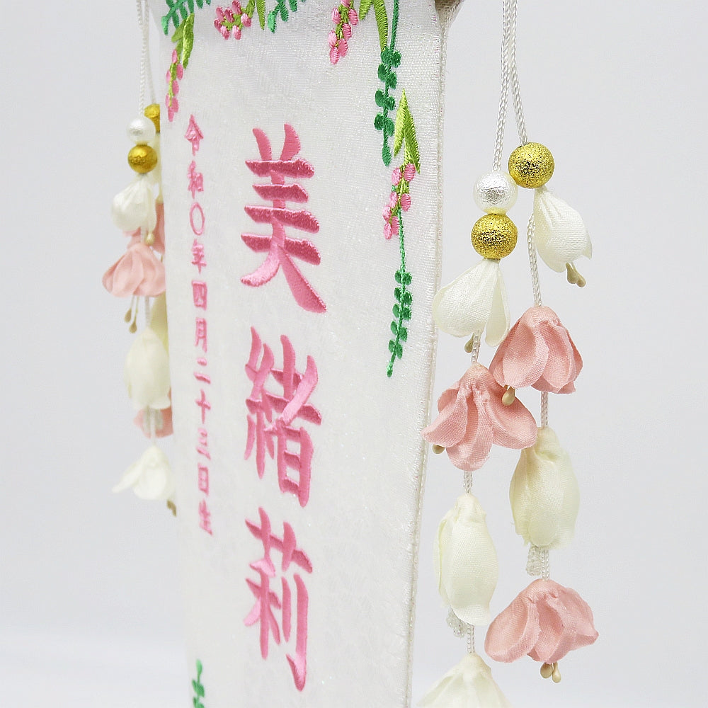 豪華金糸太楷書体の刺繍仕立ての名前旗飾りで御名前と生年月日をお入れ致します。