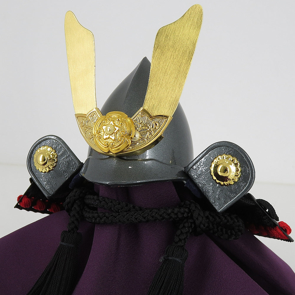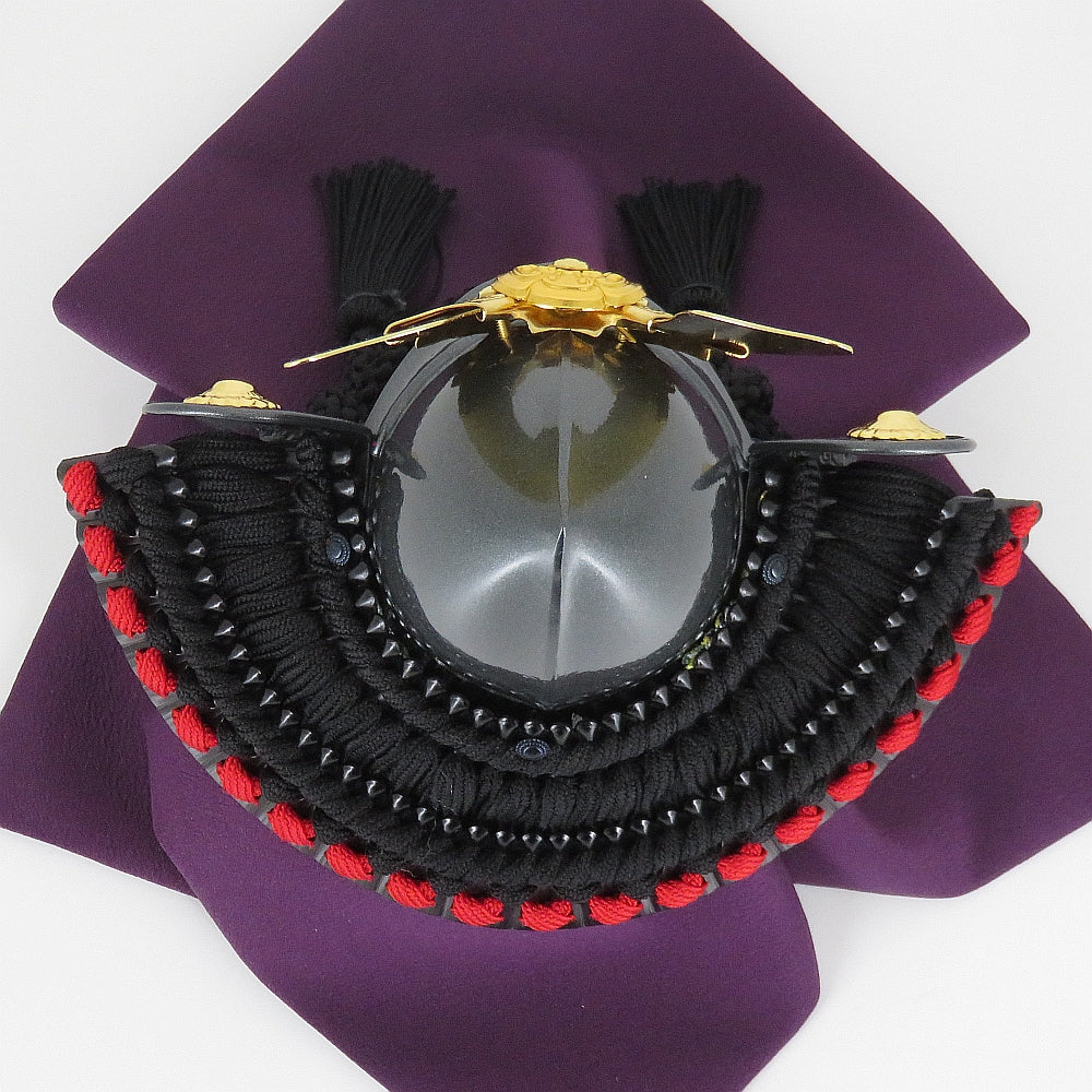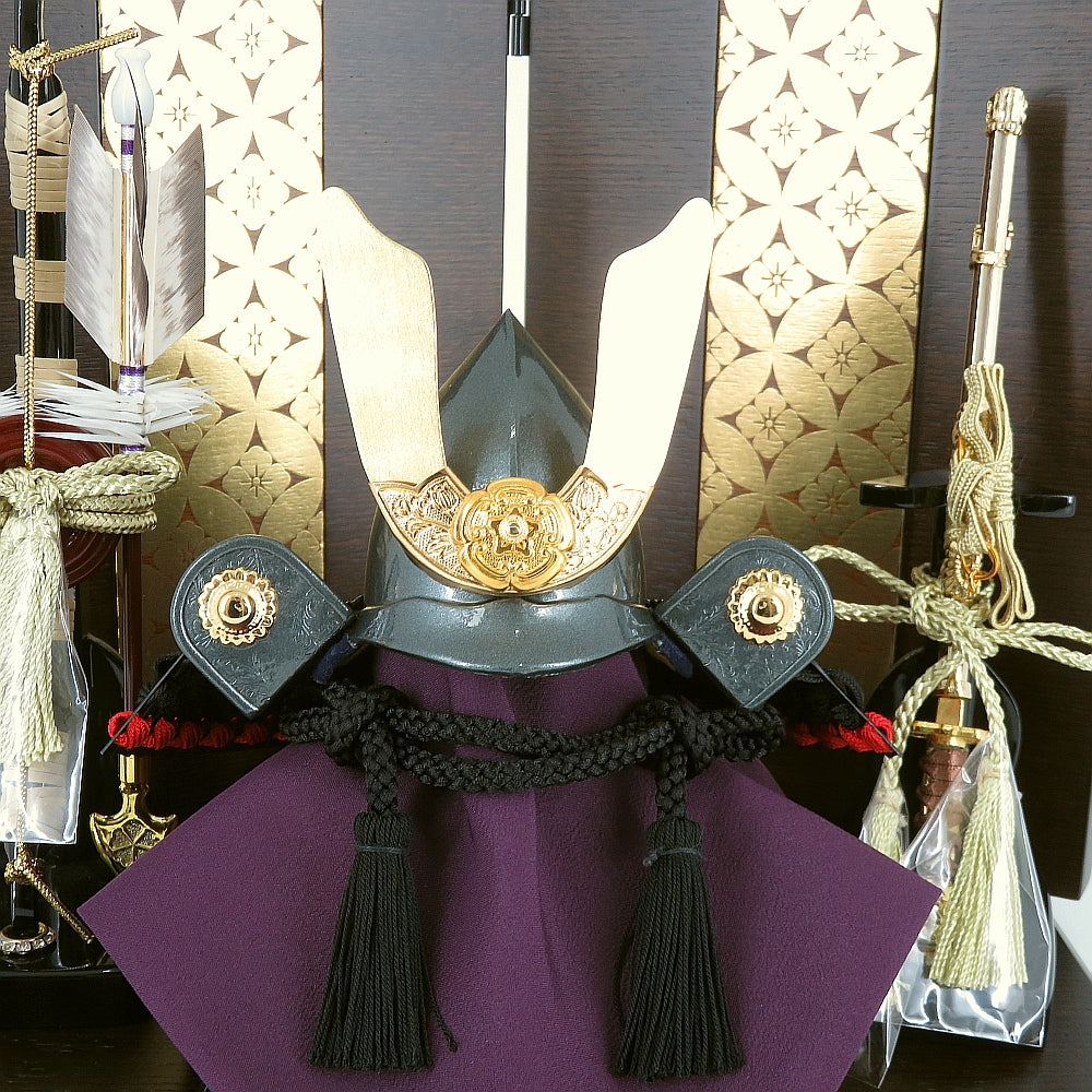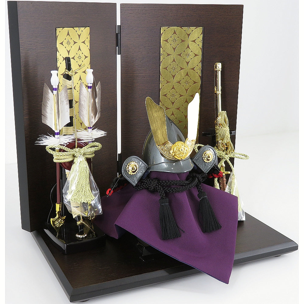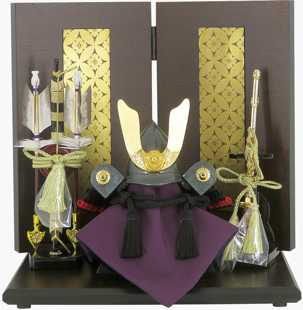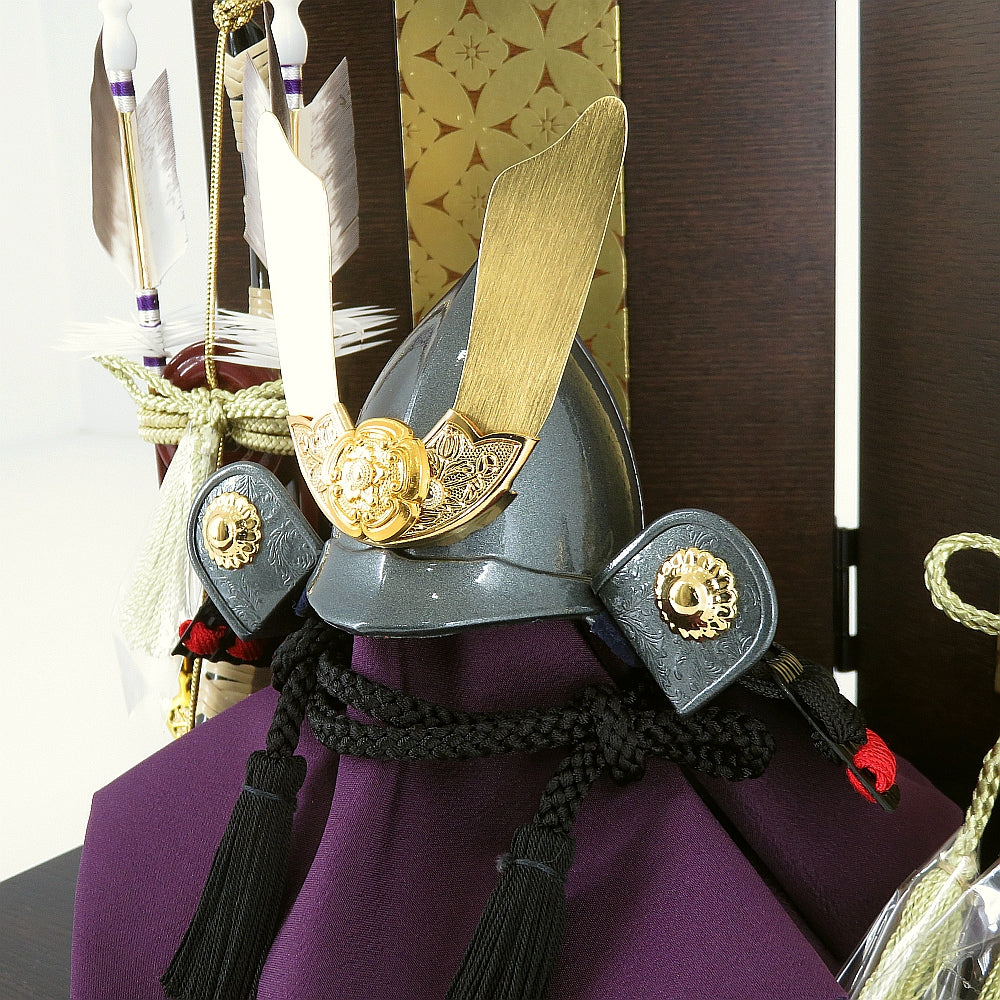 縁起の良い駿河本金七宝蒔絵の屏風が上品に兜を引き立てます