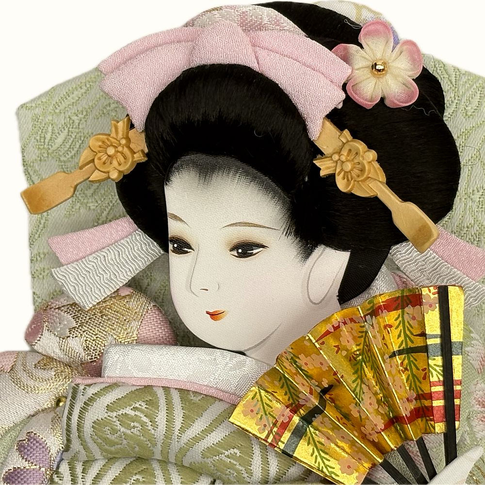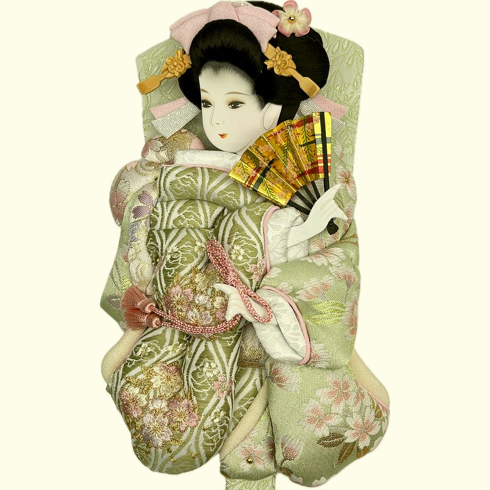 命の喜び芽吹いたばかりの草木の葉の色萌黄で仕立てた押絵振袖羽子板飾りです