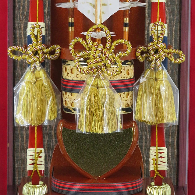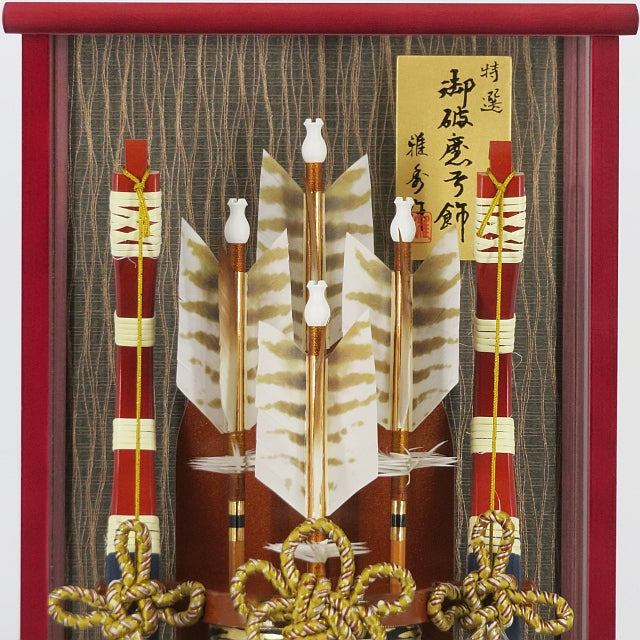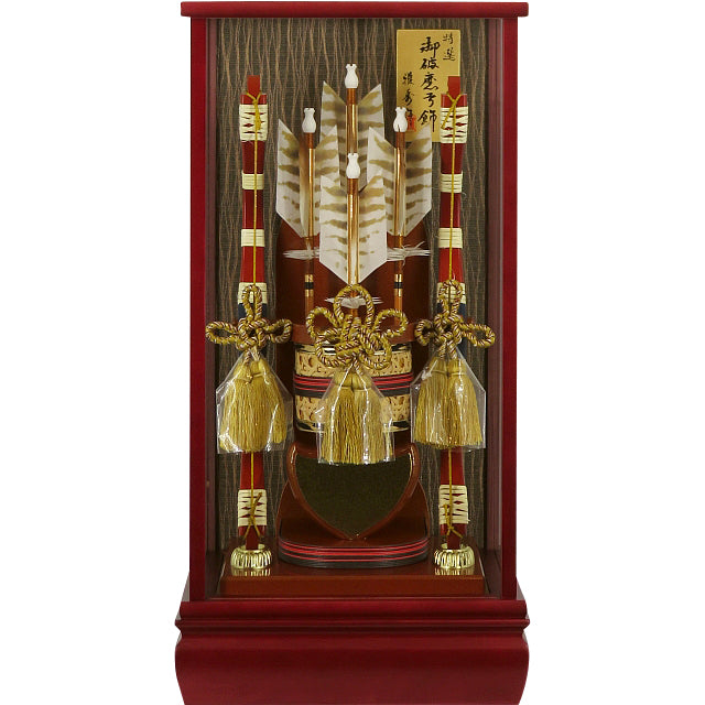 杢目調のケースで落ち着きのあるデザイン、コンパクトな破魔弓飾りです