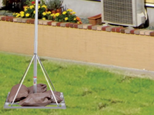 ポールの固定に杭や金具を使用しないで、移動可能なスタンド式で水袋の重りで手軽に設置可能です