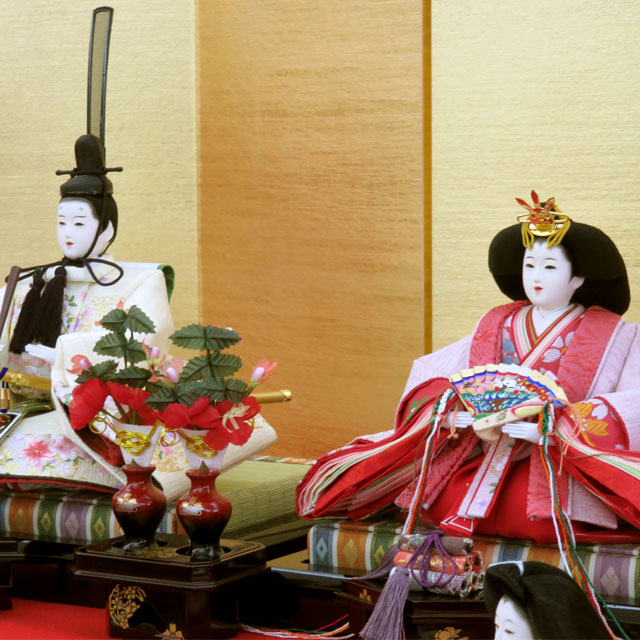 おひな様飾りの伝統的スタイル金沢箔押金屏風に緋毛氈で飾りました