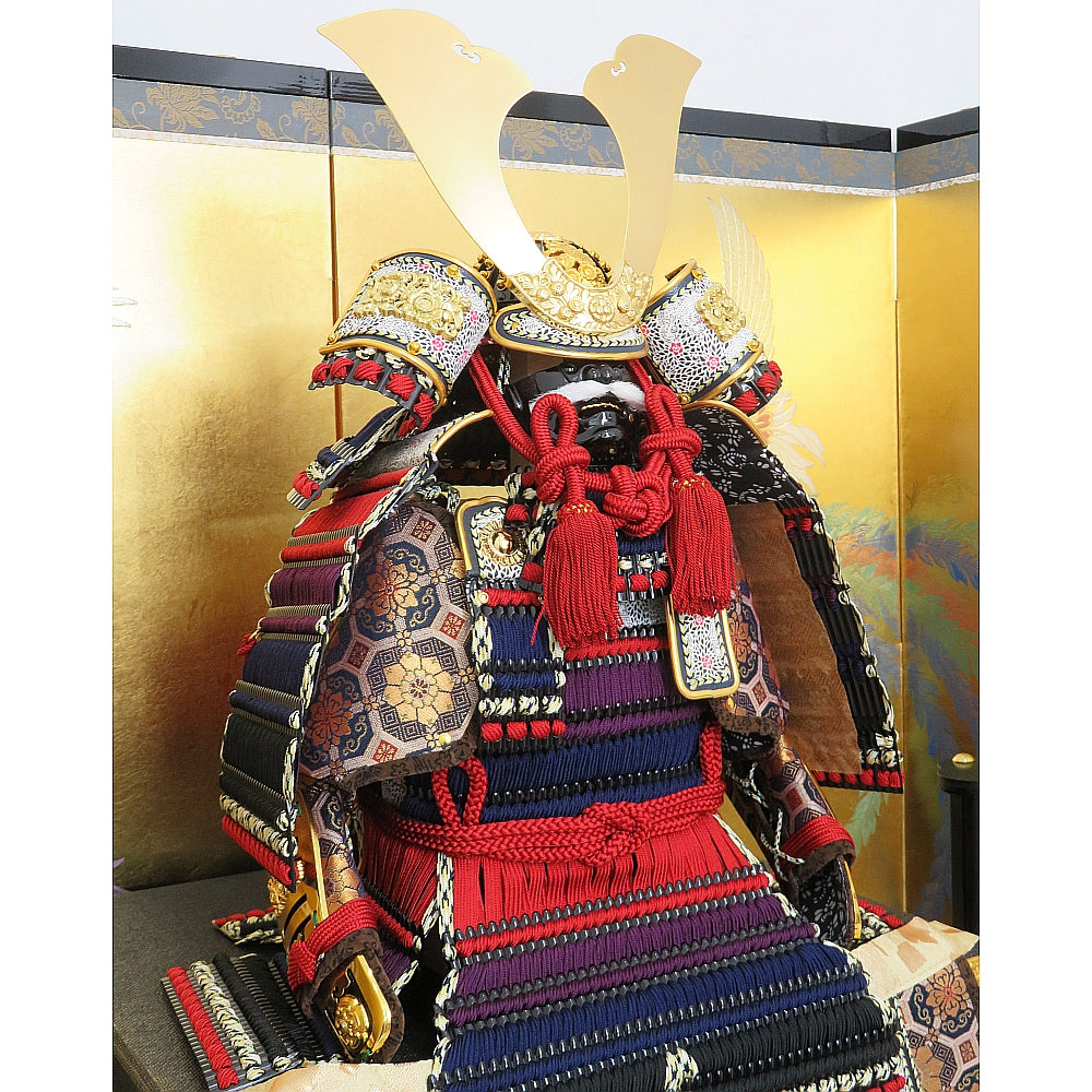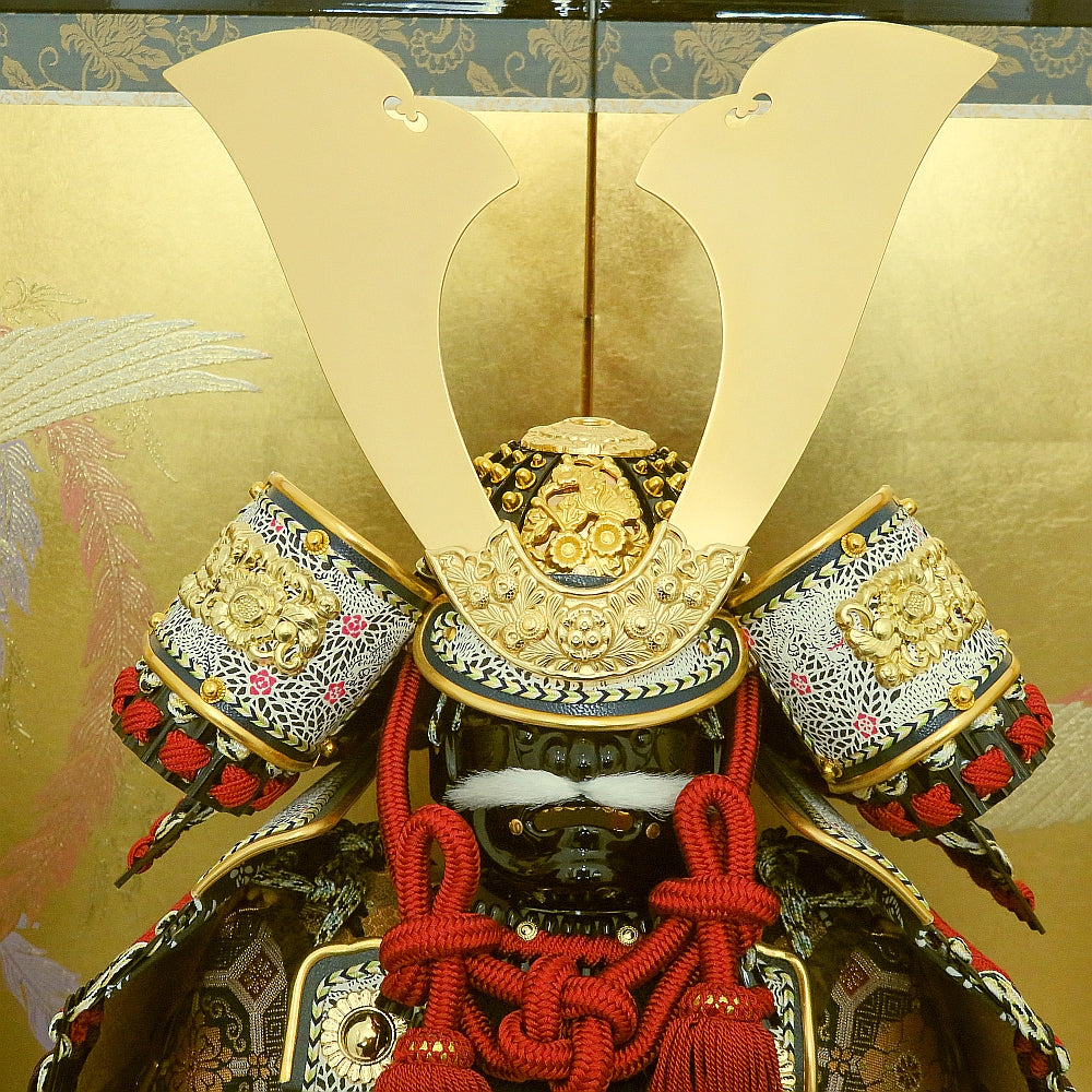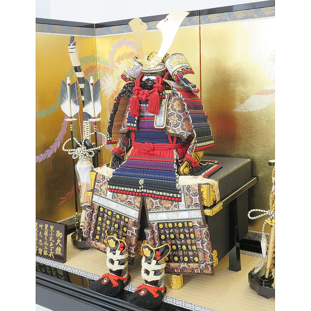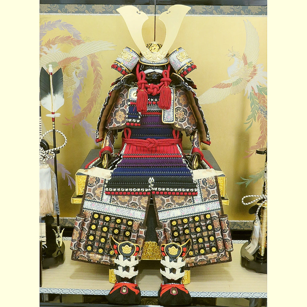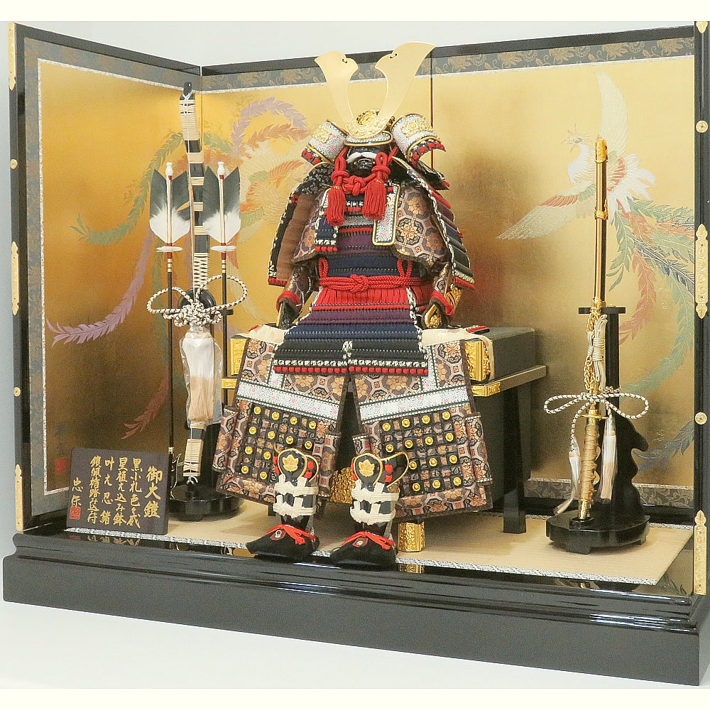 雰囲気のある見事な鳳凰の金箔屏風に栄え、存在感ある豪華な鎧飾りです