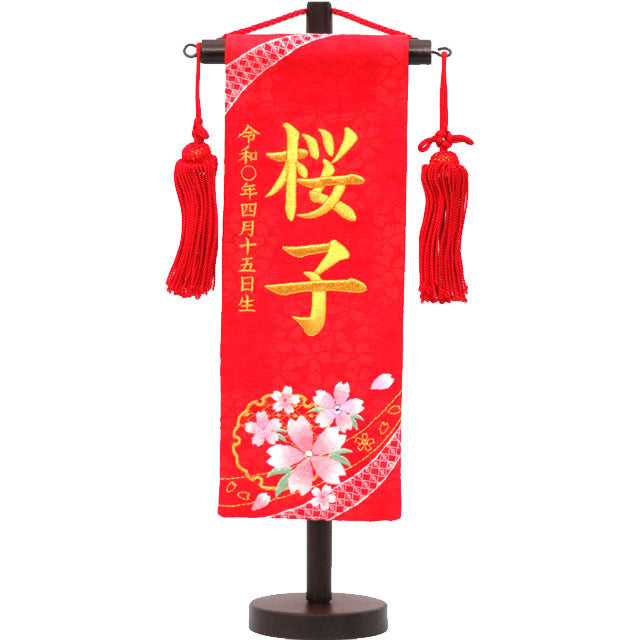 豪華金糸太楷書体の刺繍仕立ての名前旗飾りで御名前と生年月日をお入れ致します。