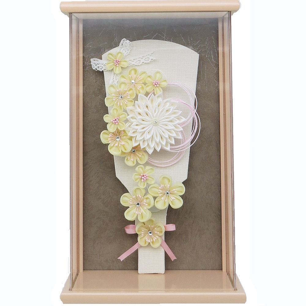 奥行薄型でコンパクトにお飾りいただける可愛らしく華やかなアイボリーベースのアクリル額入り羽子板飾りです