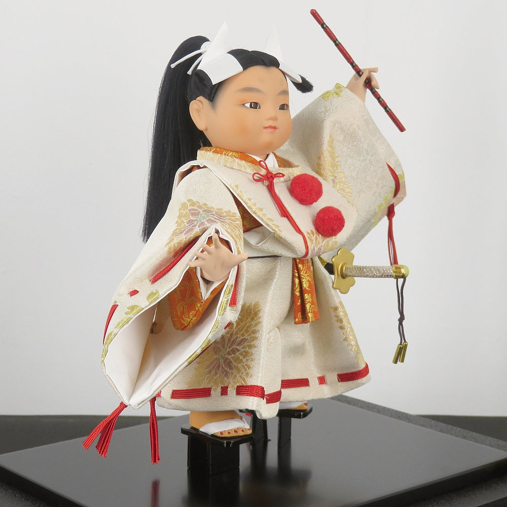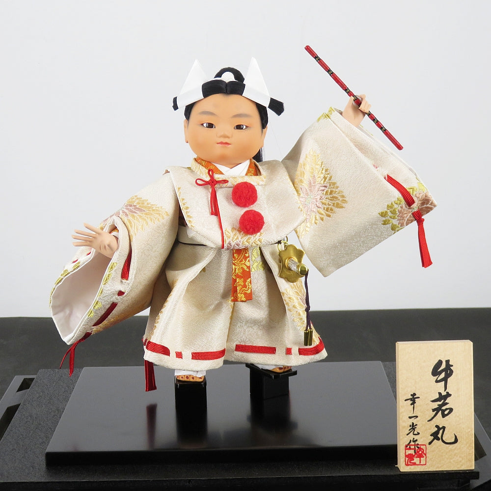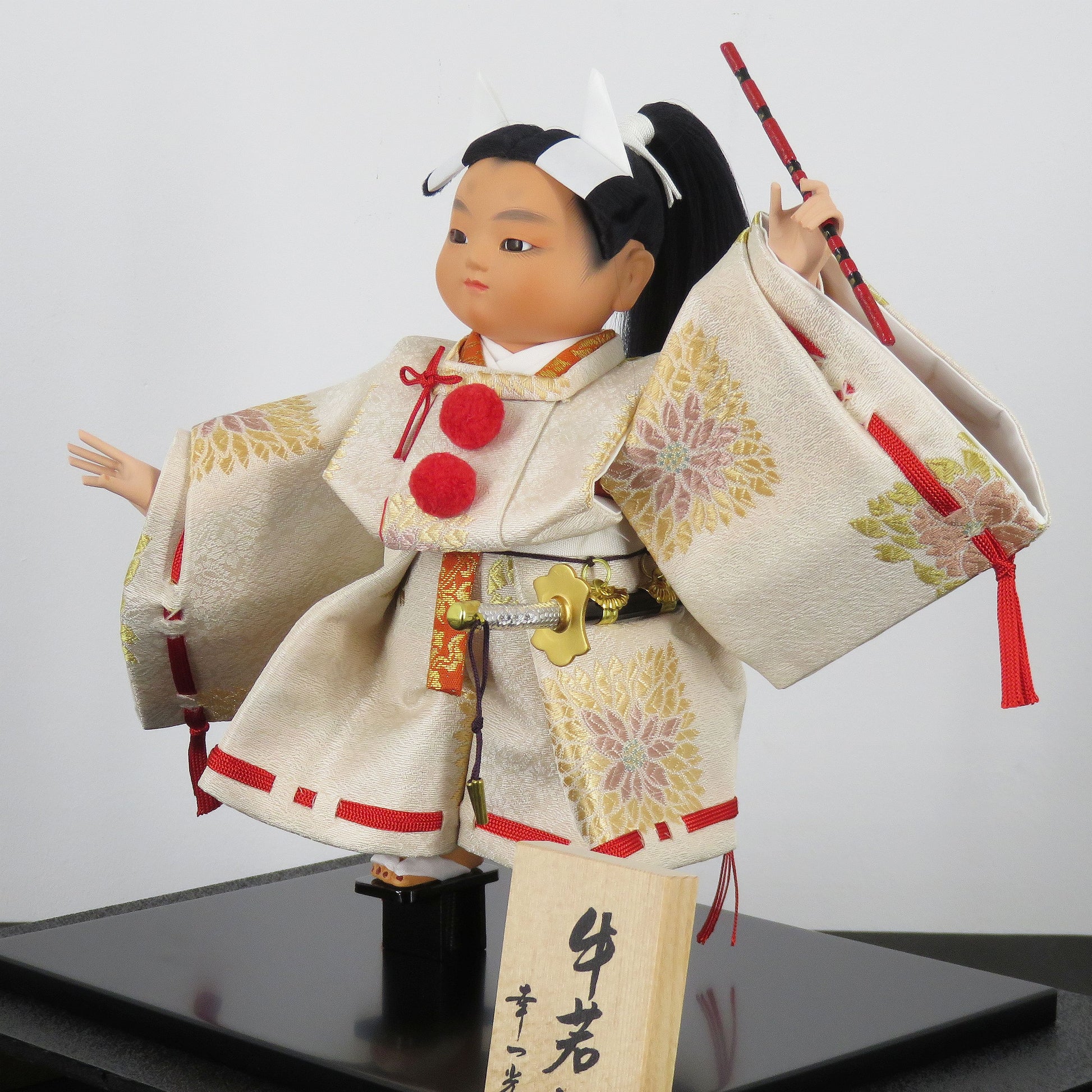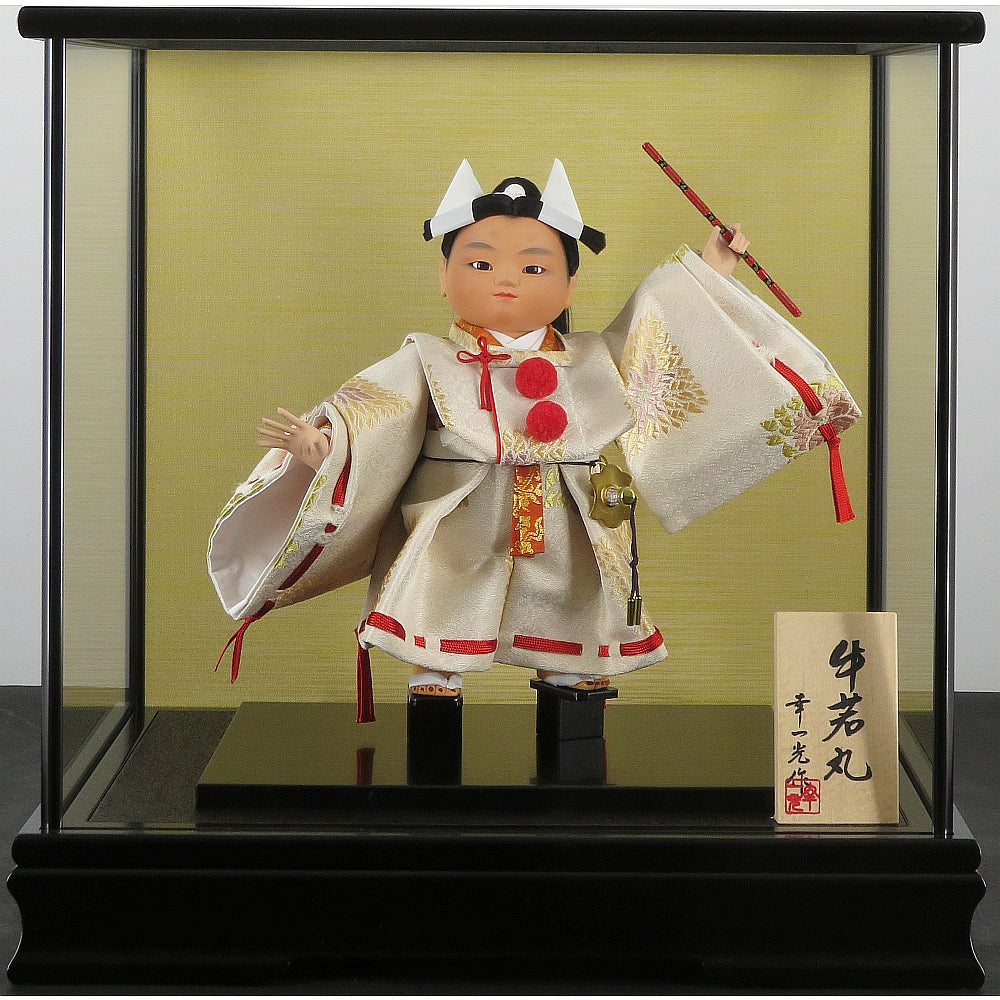 勇ましく凛々しい表情の牛若丸ガラスケース入りです