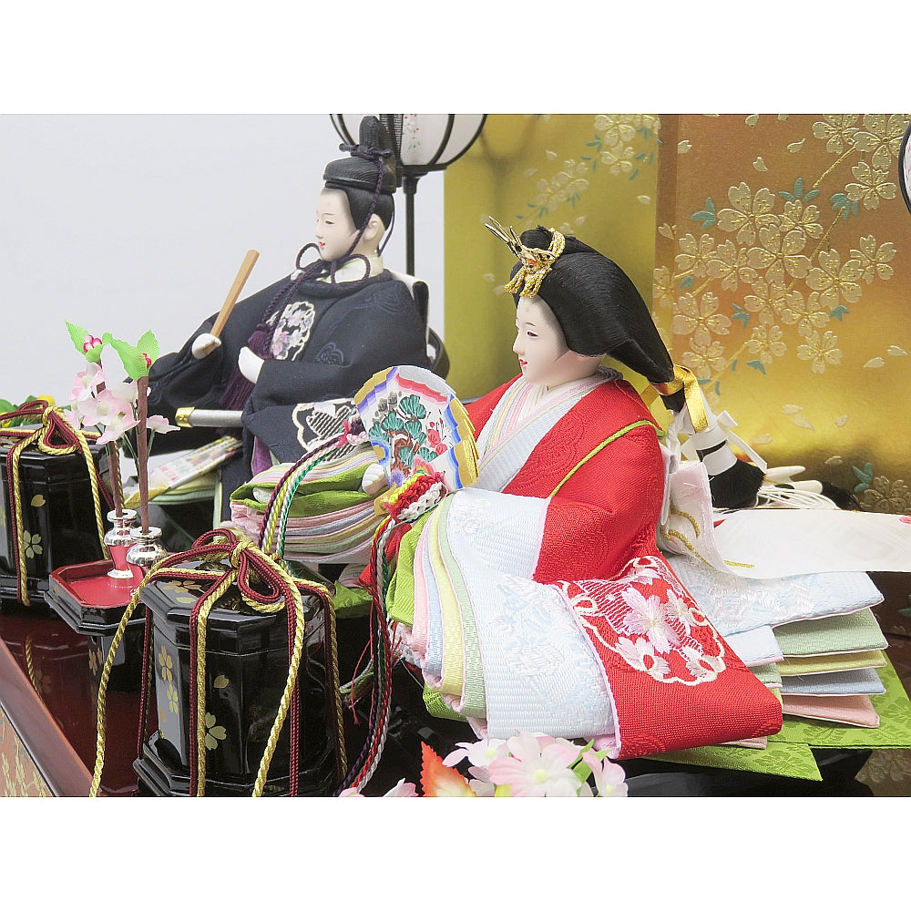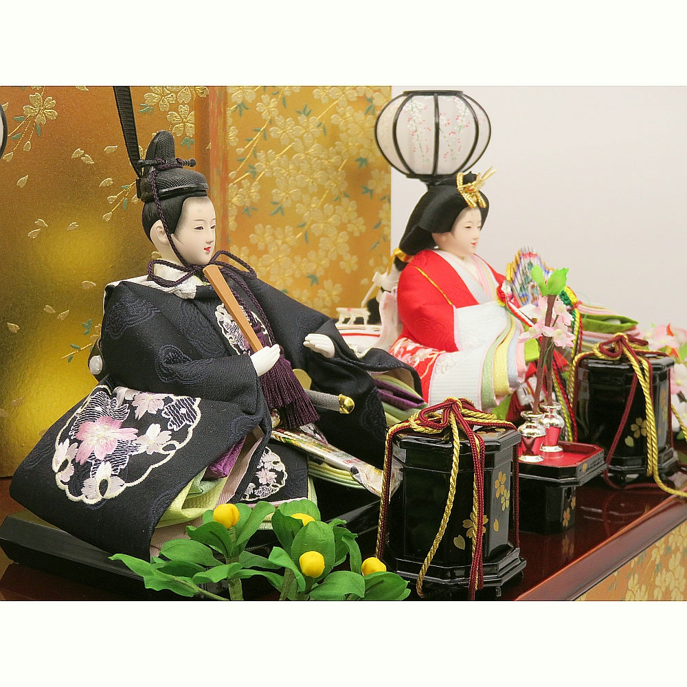 満開の箔桜が雰囲気ある屏風と飾り台でお雛さまをいっそうひきたてます
